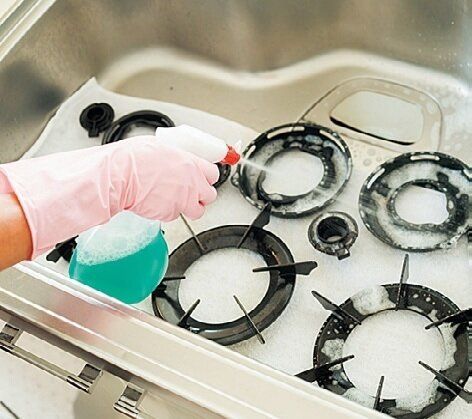 五徳などはずせる物はすべてはずし、シンクの中でアルカリ性洗剤をスプレー。傷つき防止に古タオルを下に敷いて。