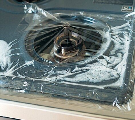 コンロ全体にアルカリ性洗剤をかけてスポンジで磨く。こびりついた油汚れはアルカリ性洗剤+ラップで、しばらくおくと◎。