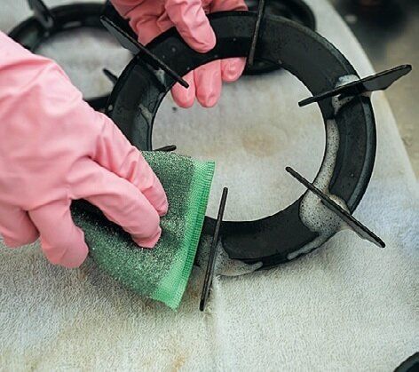 五徳などのコゲ汚れを、ラストラーレスポンジでこすって落とす。泡が乾いていたら、アルカリ性洗剤を再度スプレーして。