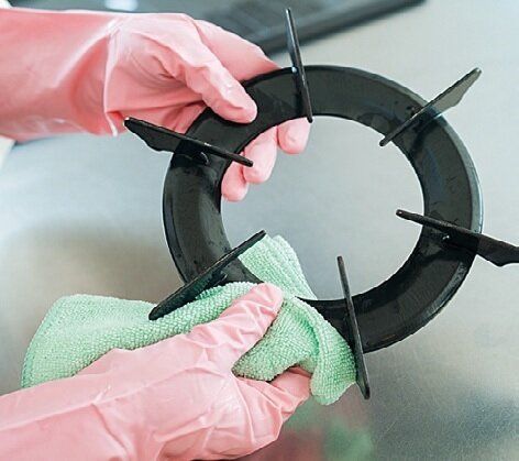 コンロをマイクロファイバーで水拭き。五徳は水で流す。どちらも水跡が残らないように、乾いたマイクロファイバーで仕上げ拭きを。