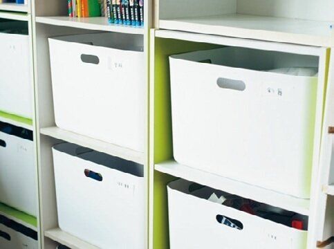 棚にピッタリサイズの箱は、キレイやけど引き出しにくく、中に何が入っているかわかりにくい。取り出しやすい箱に替えてみよう!