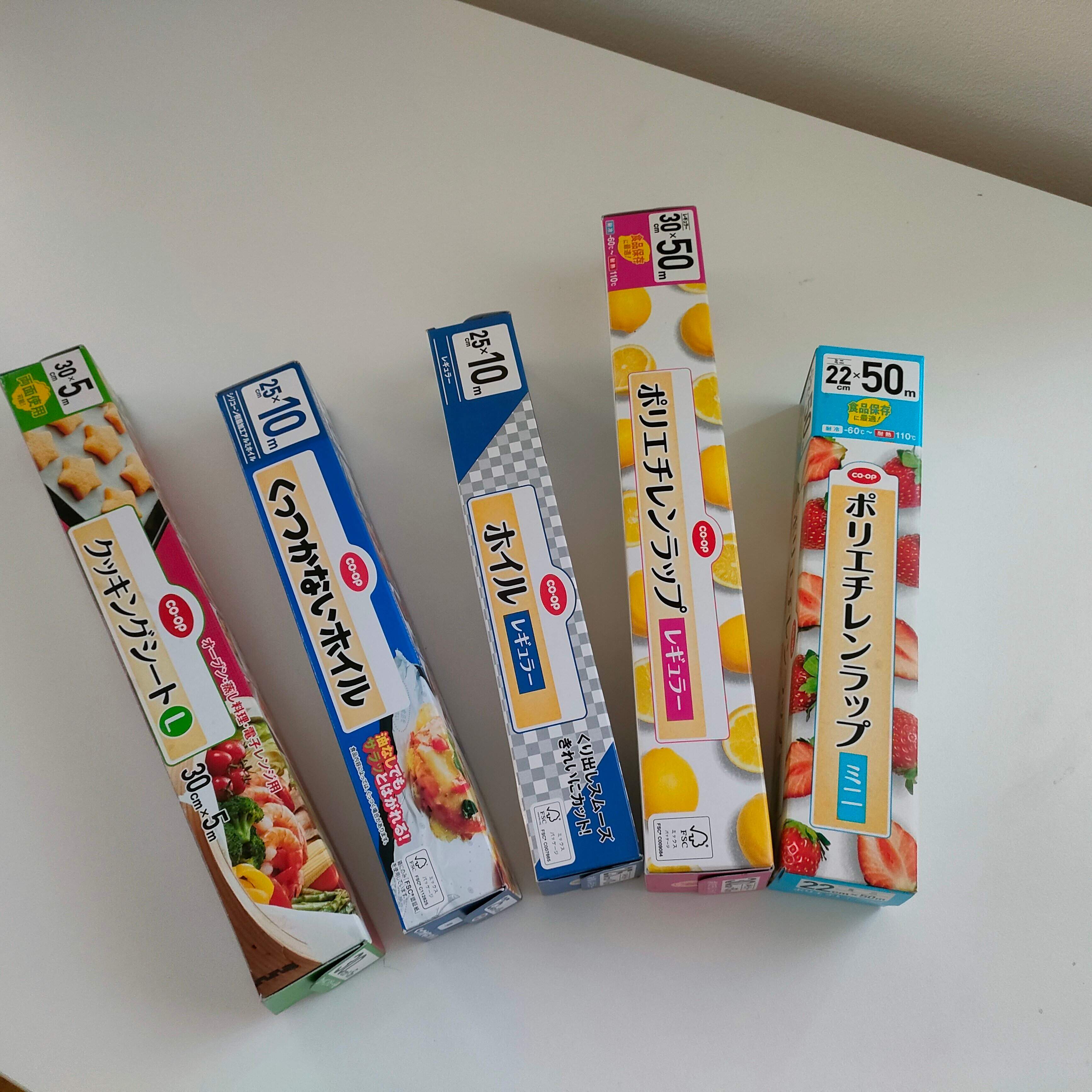 ラップ小、ラップ大、アルミホイル2種、クッキングシートと5つもあることに気が付きました。