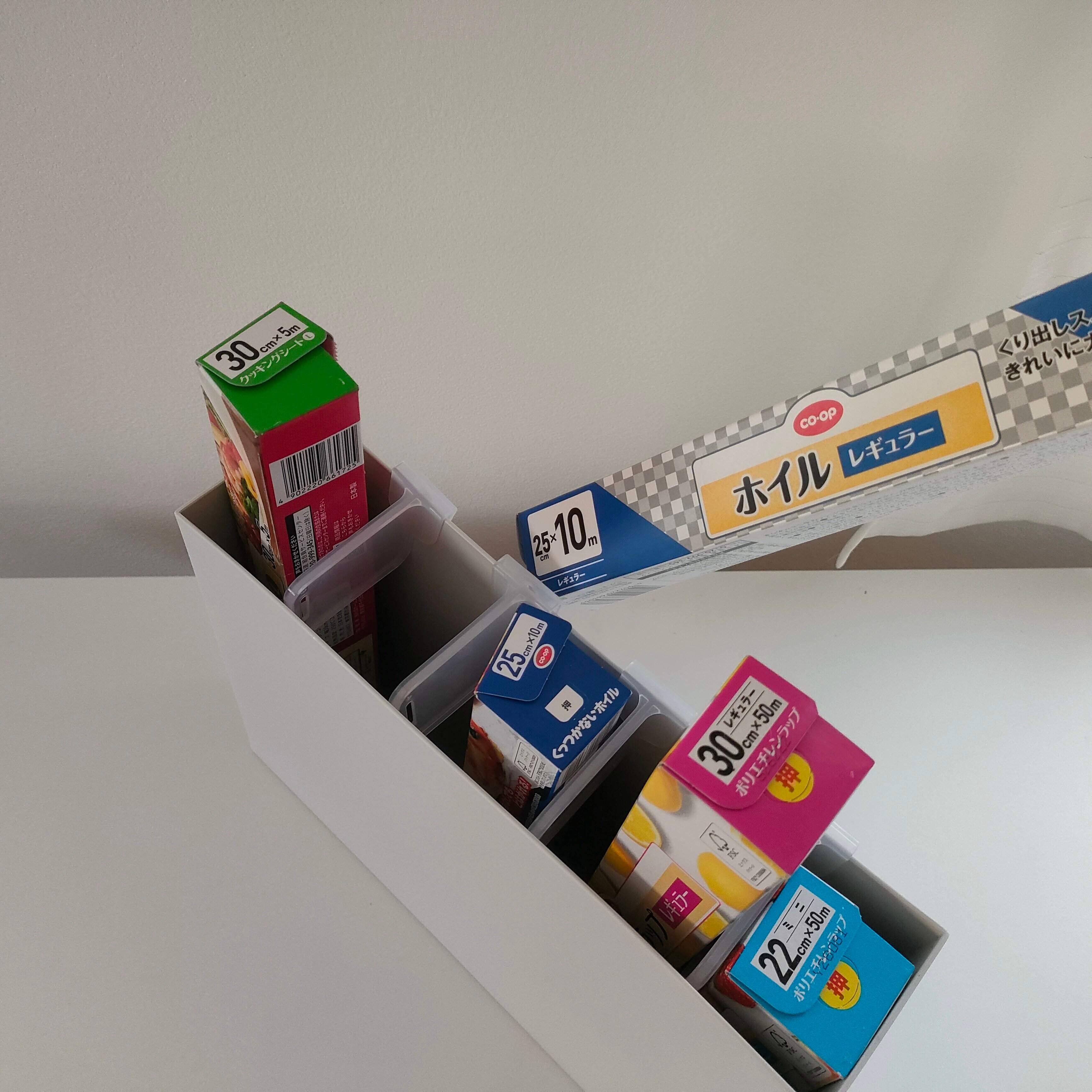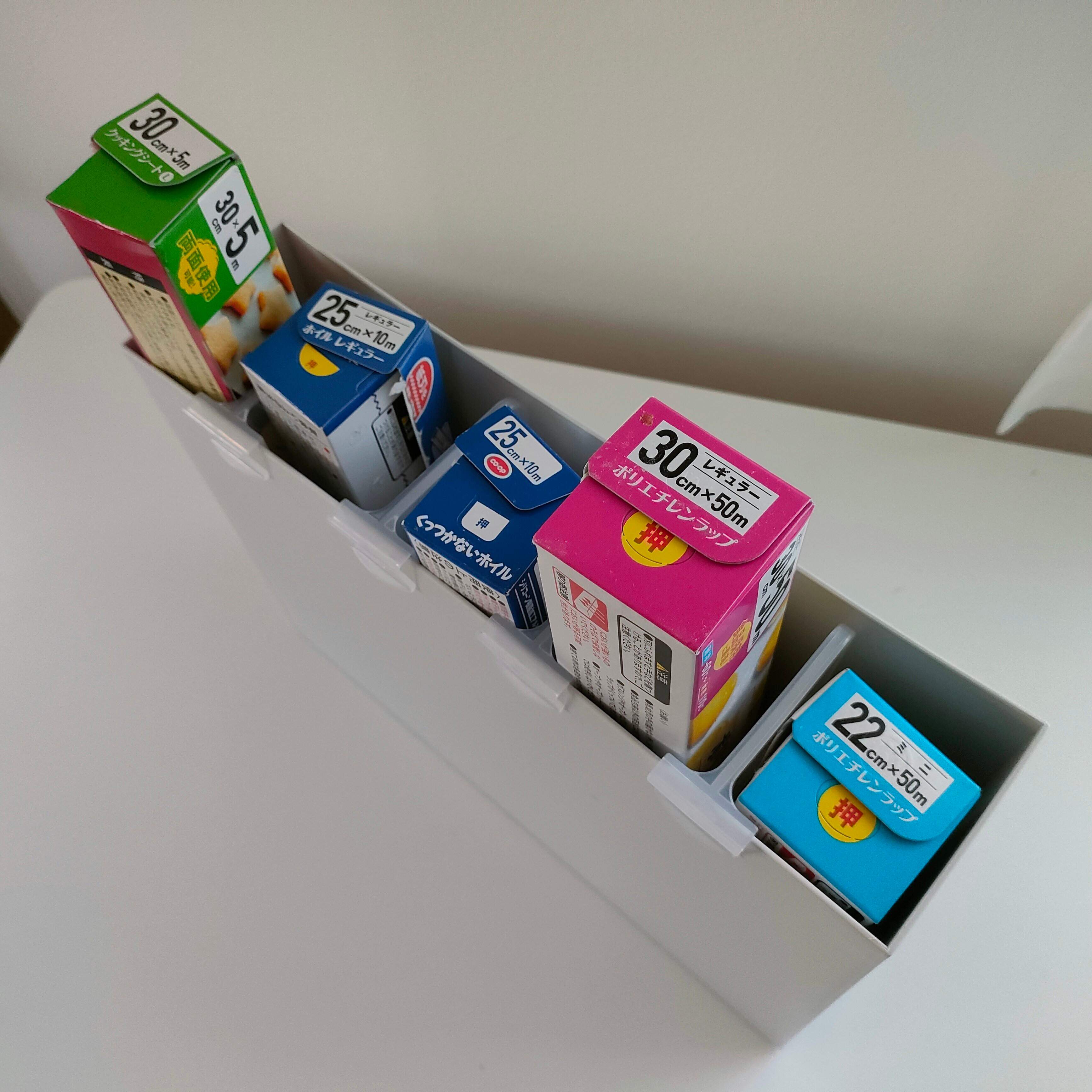 あとはラップ類を収納していけば、あっという間にジャストフィットした立てる収納の完成です。