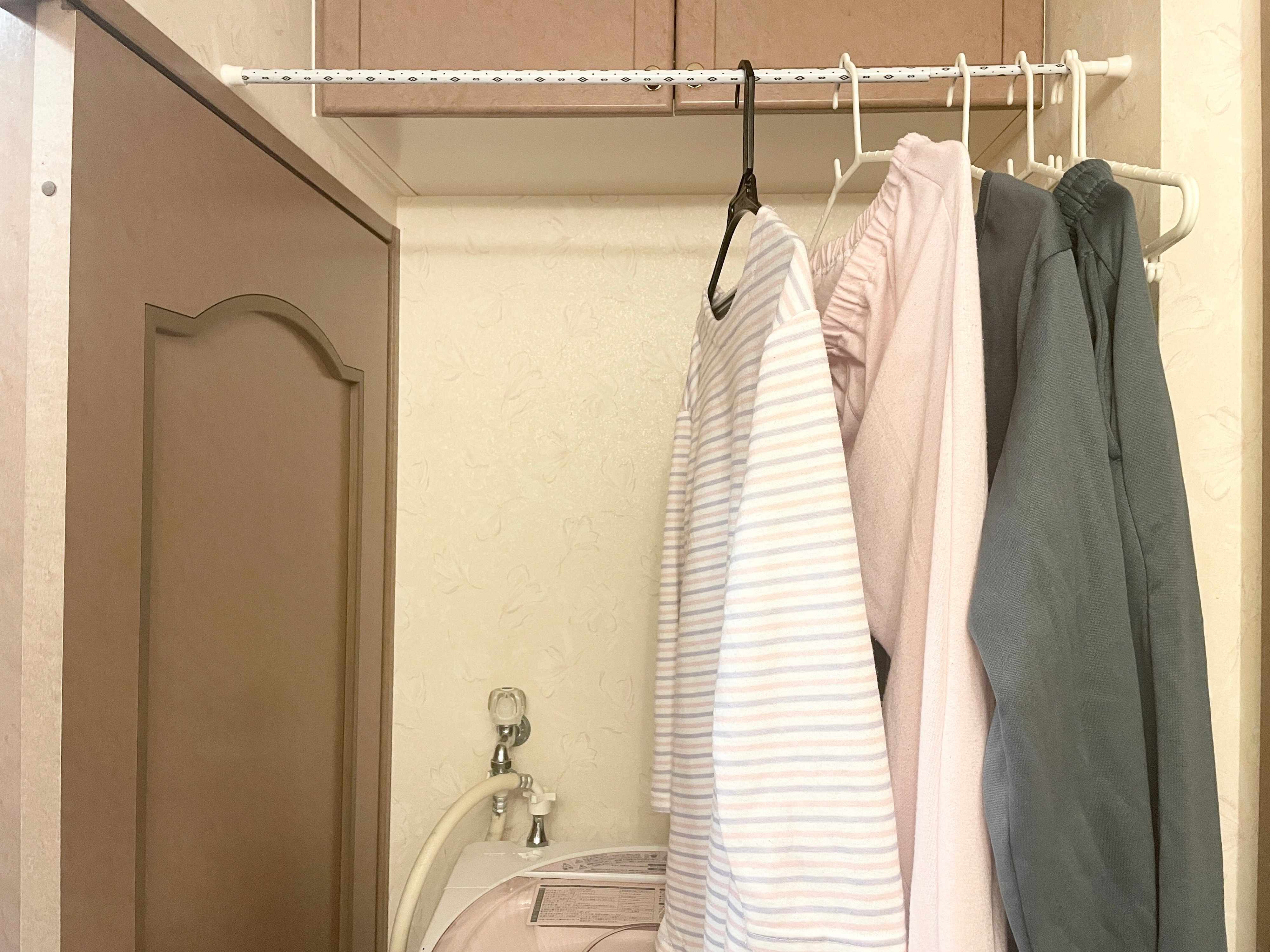 ハンガーにかけて干したパジャマが乾いたら、そのまま洗濯機上のつっぱり棒へ。
