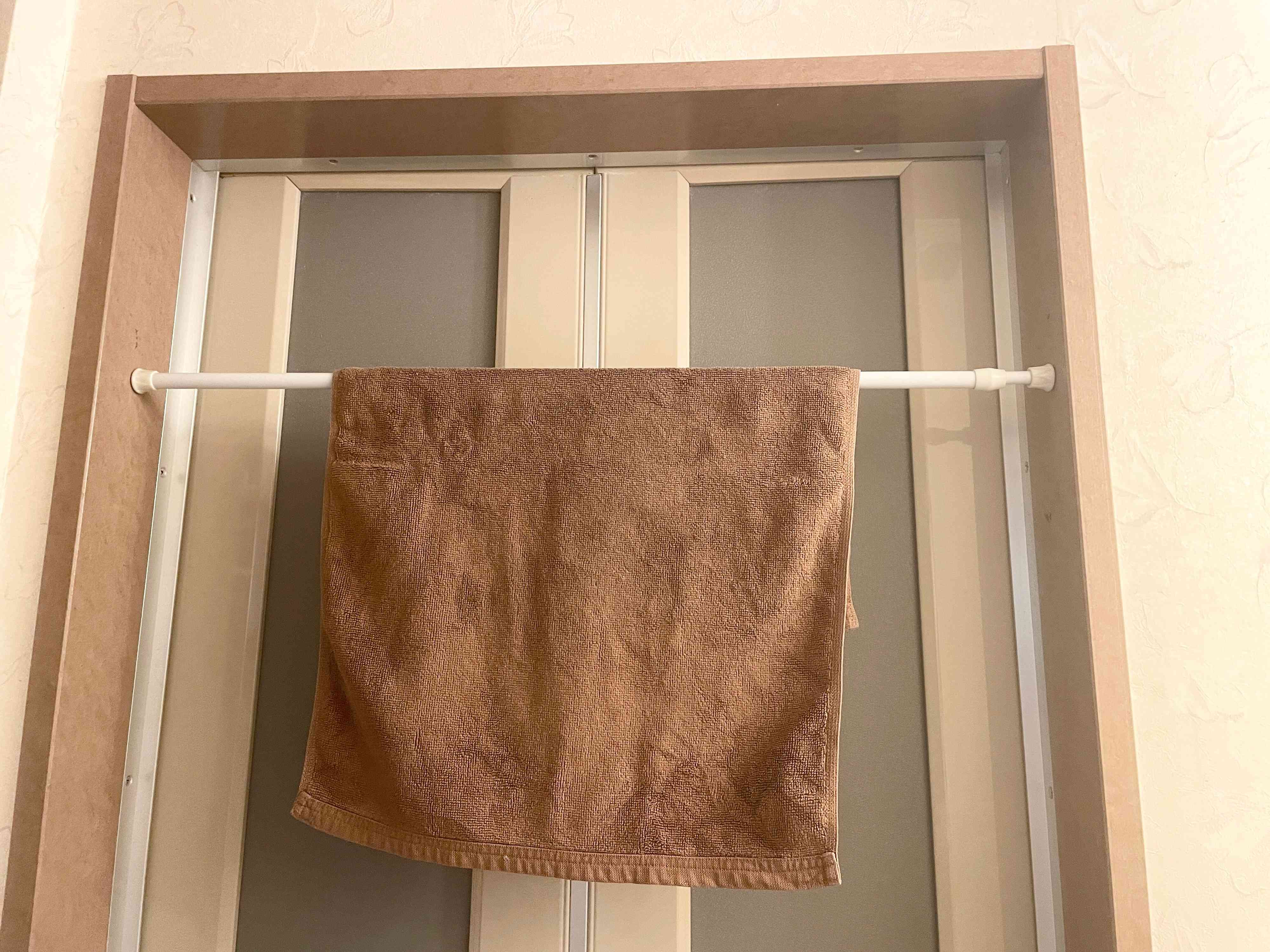 浴室のドア前につっぱり棒を設置するのもまた便利です。使い終わった足ふきマットをかけておけますよ。