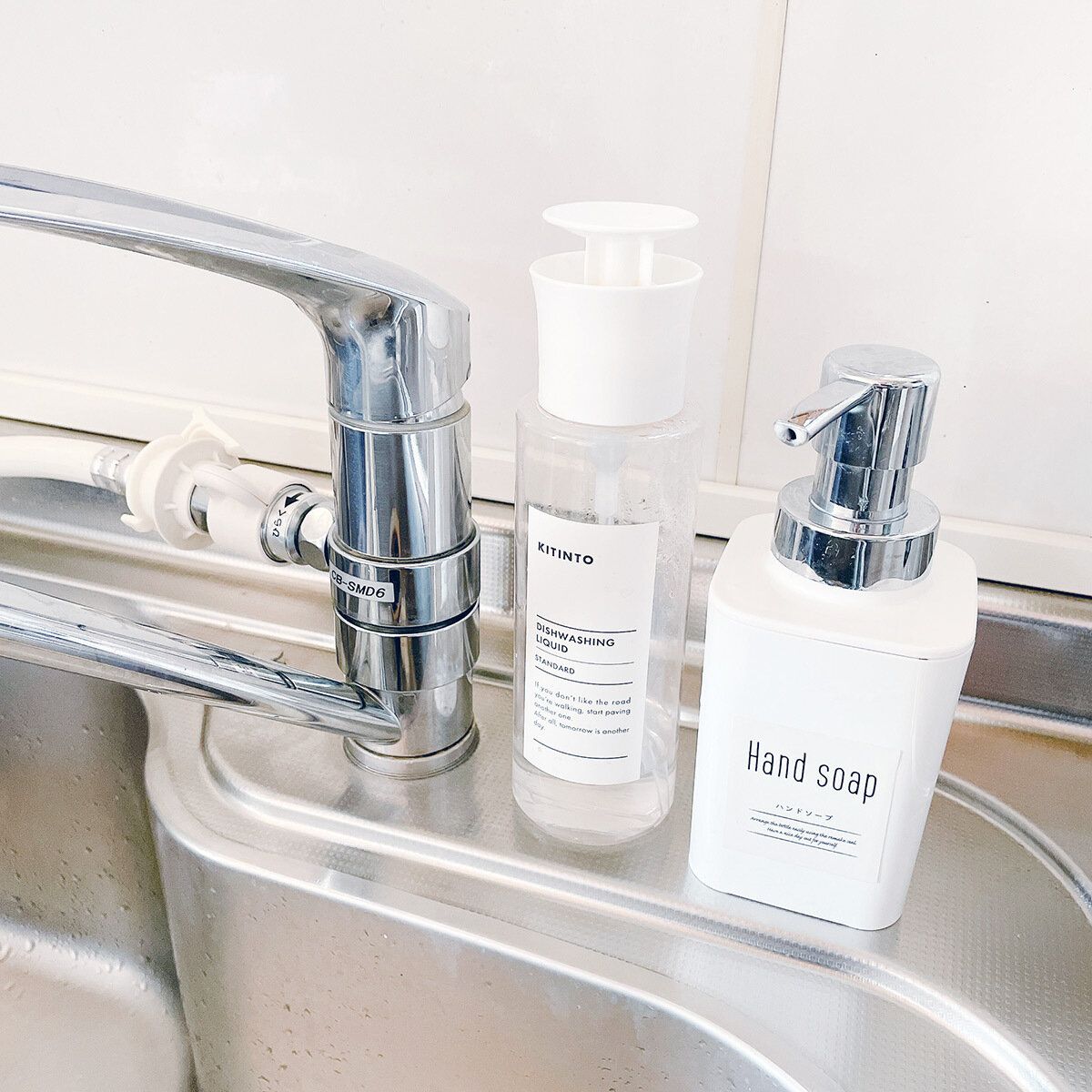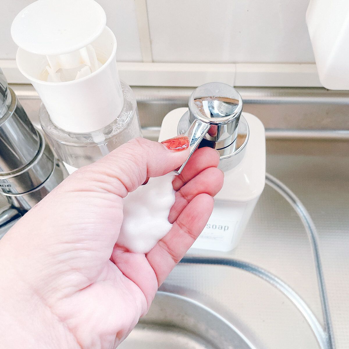 スマホを手に持って撮影したので写真では片手ですが、ふだんは右手でポンプを押して左手にハンドソープを出しています。