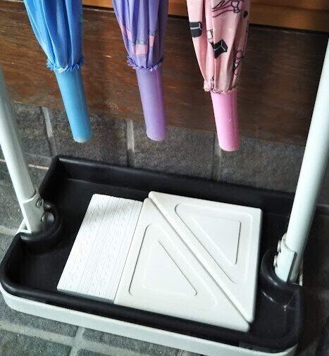 傘立ての下には水受けトレーが付いているのですが、雨の日に、家族6人分の傘をかけるとかなりの水が溜まります。