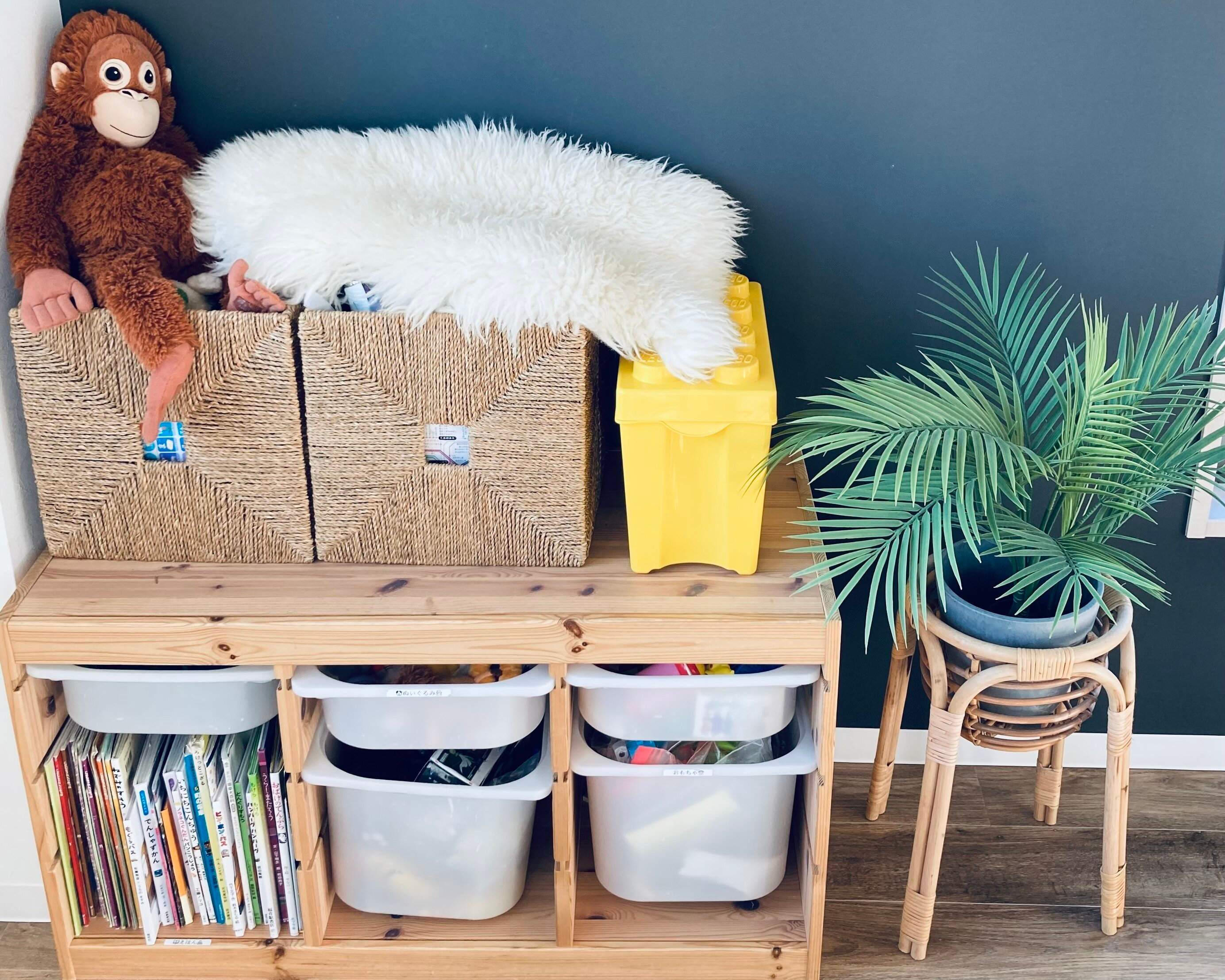 子ども部屋となると植物のハードルは高くなりますが、フェイクでも大丈夫!実際にわが家ではフェイクを置いています。また、イスに関してもスツールや折りたたみでも構いません。一脚あれば座る用途だけではなく、カゴ等の置き場にもなります。