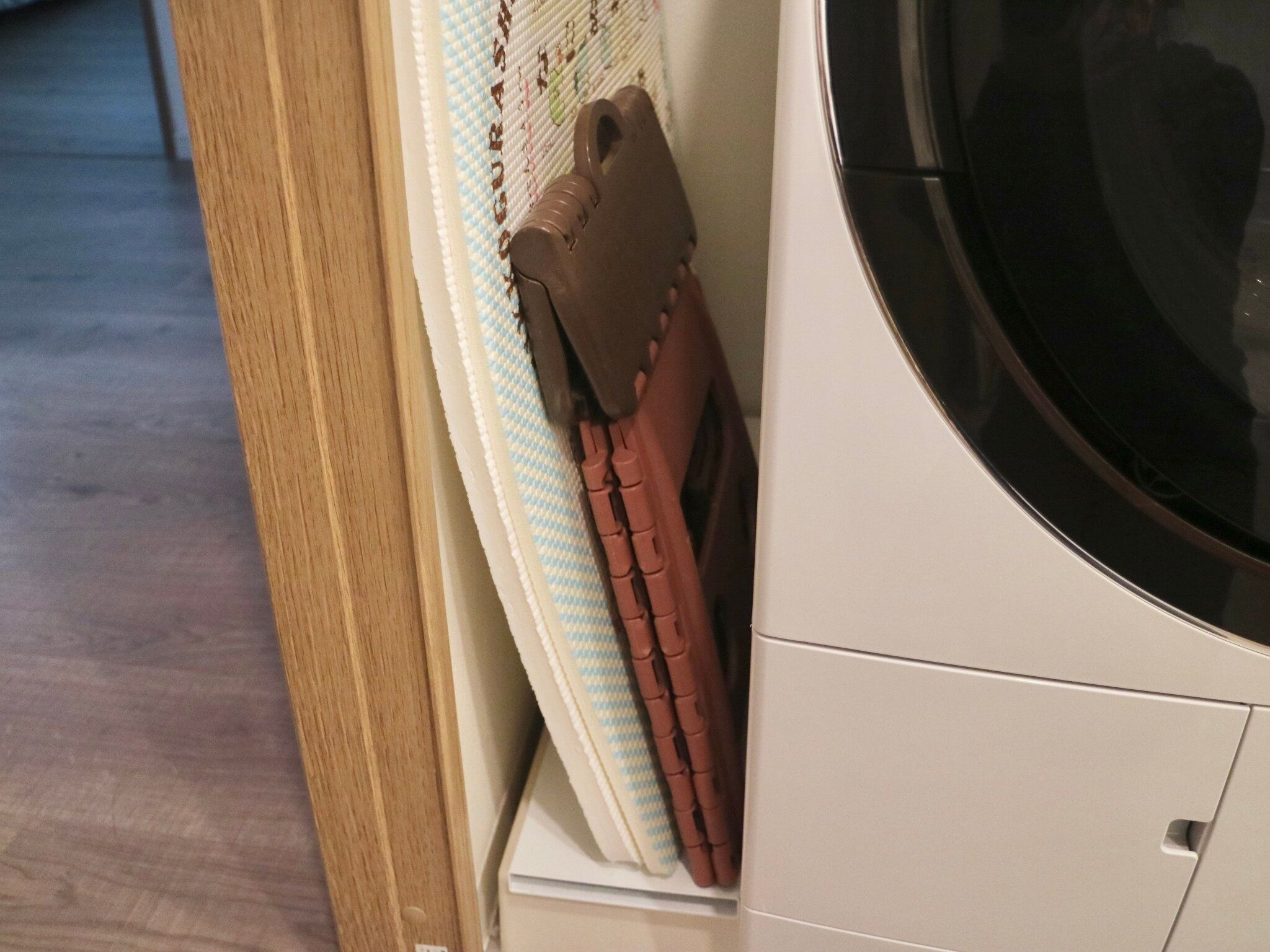 わが家はお風呂上がりに子どもたちが床に座って着替えるので、入浴時には毎回洗面室にバスマットを2枚敷き詰めています。これがけっこう場所をとるので、洗濯機横の収納がちょうど良いスペースでした。