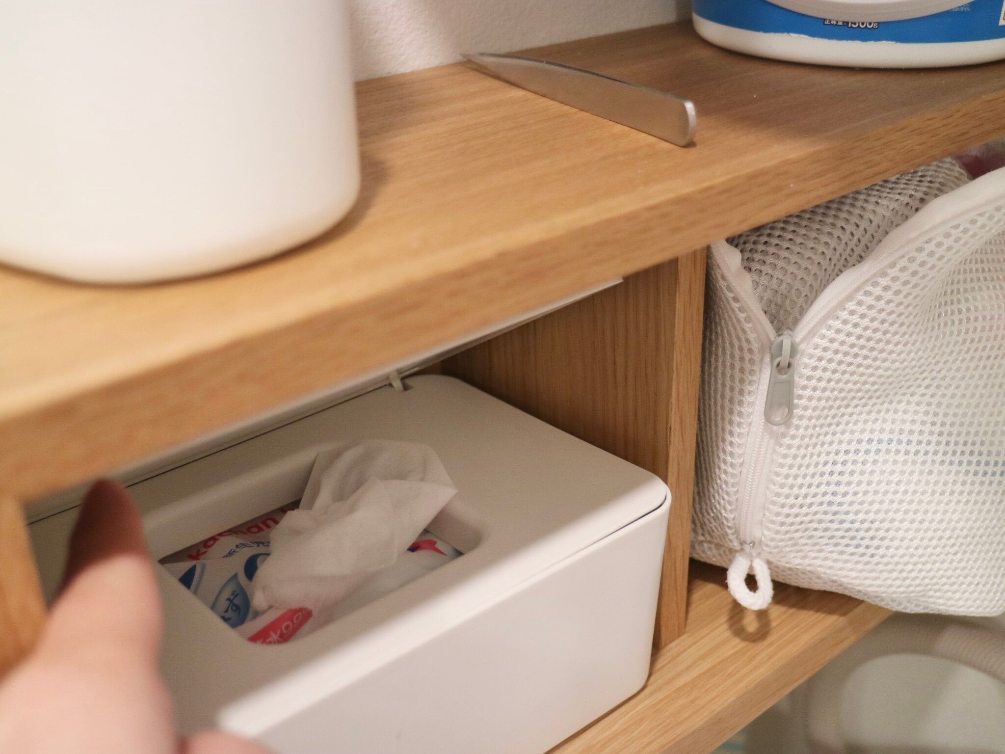 ドラム式の洗濯機をつかっているのですが、乾燥がおわったあと扉のパッキンまわりの埃を掃除するのにウェットティッシュでサーっと拭くのがとても便利!また、床や小物などのちょっとした掃除にも使えるので、ウェットティッシュはここが定位置です。いまは子どものおしりふきを大量に在庫しているので家中で万能につかっていて実はこれもそのひとつ。お子さんがいる家庭あるあるですよね。