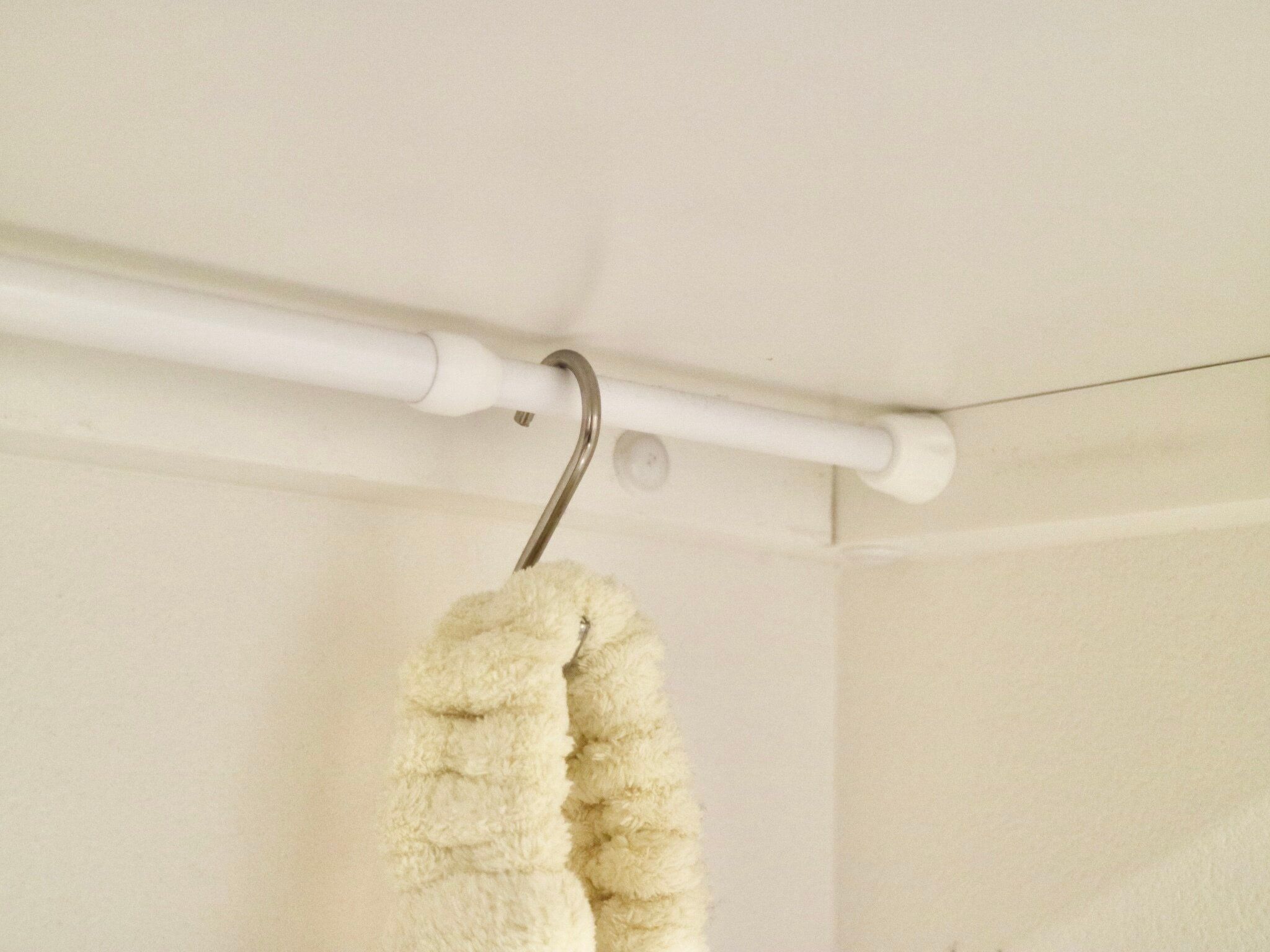 なので、取り付けるときの位置にコツがあります。そのコツとは、棚と壁に極力近づけて角の位置に取り付けること。この写真は下から覗き込んでいるのでよく見えていますが、正面からみると突っ張り棒は目立ちにくいですよ。