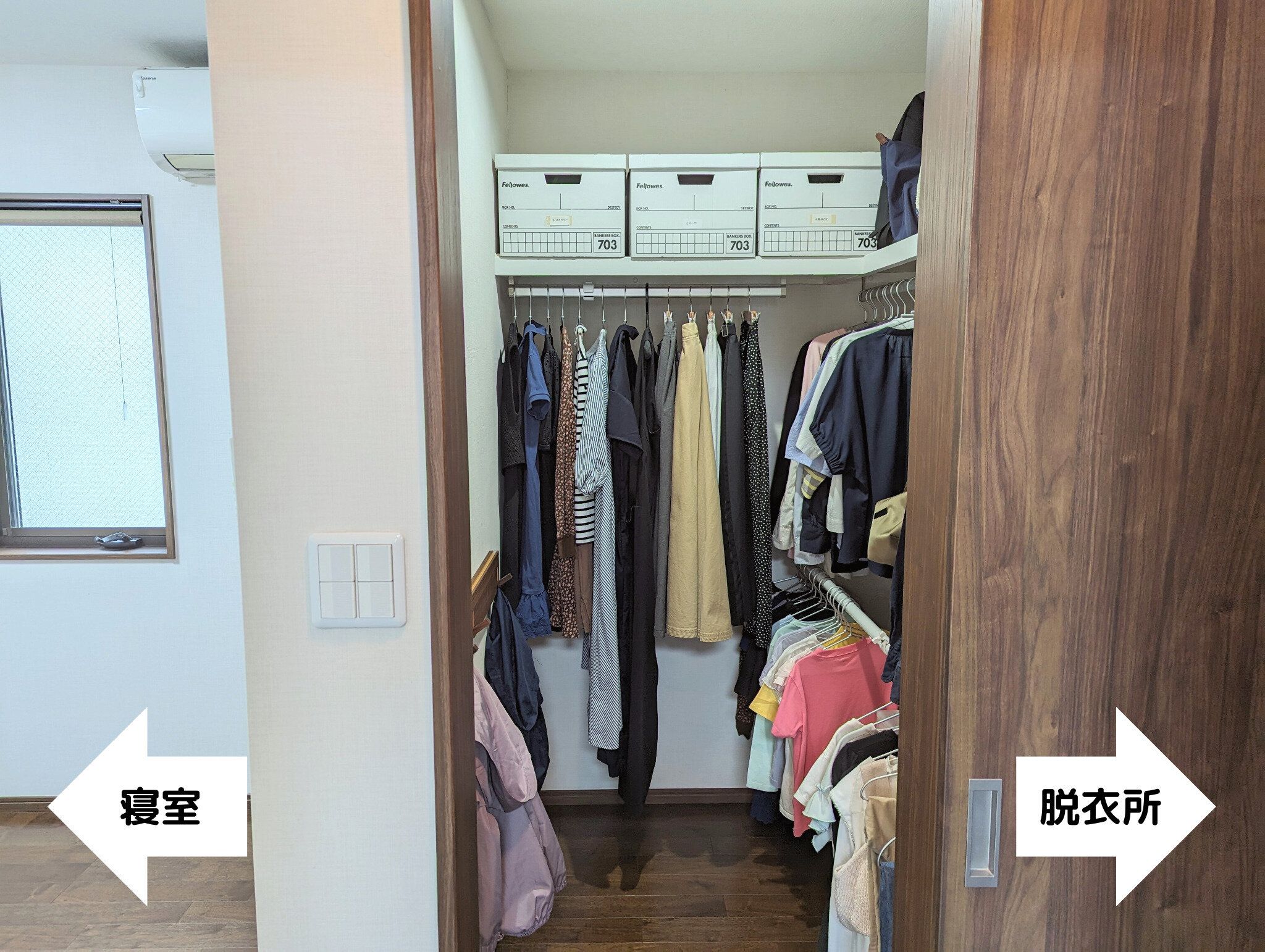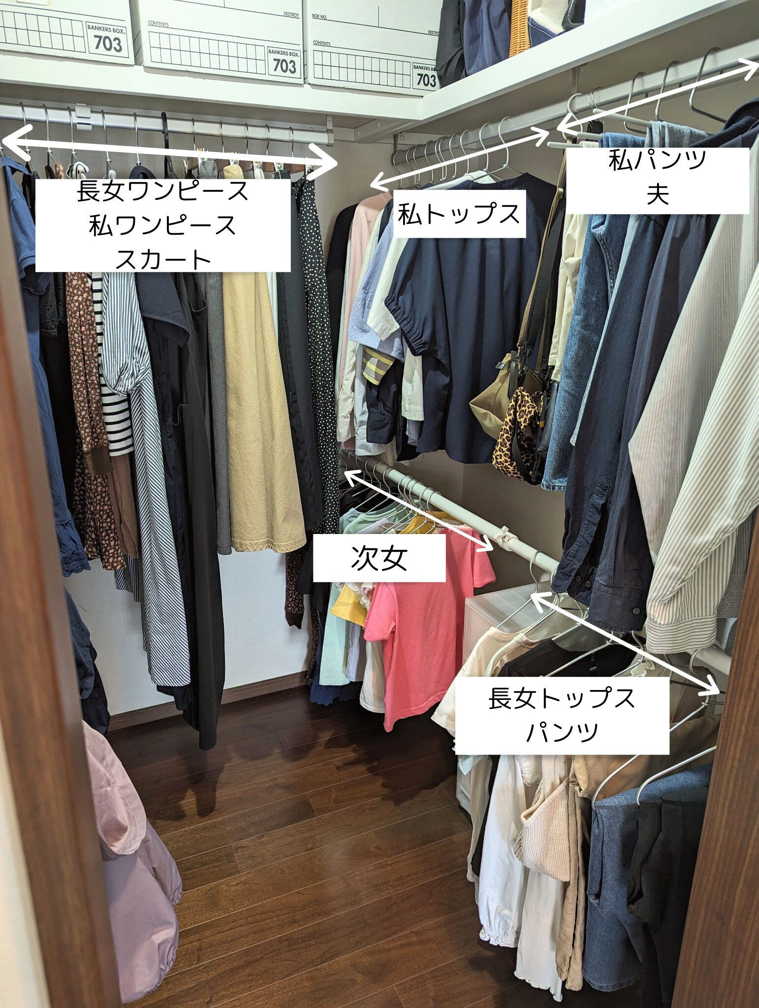 元々は夫婦の衣類を収めるための約1.4畳のスペースに、家族4人分を使いやすく収納する工夫をまとめてみました。