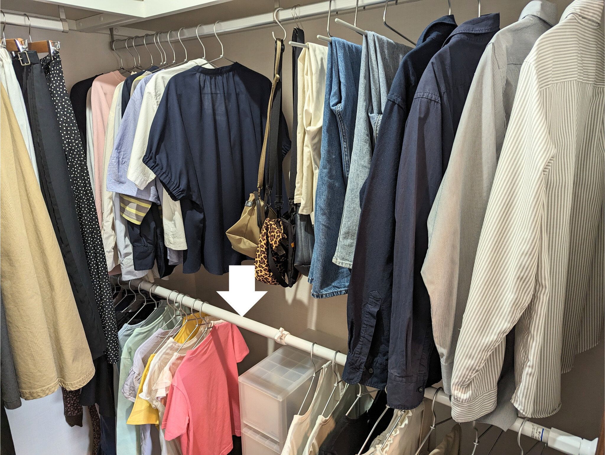 つっぱり棒を追加した側の上段には、大人のトップス類を。こうすれば、下段の子どもたちの洋服に重ならずに収められ、使いやすさと見た目のすっきりはそのままに、収納力を上げられます。