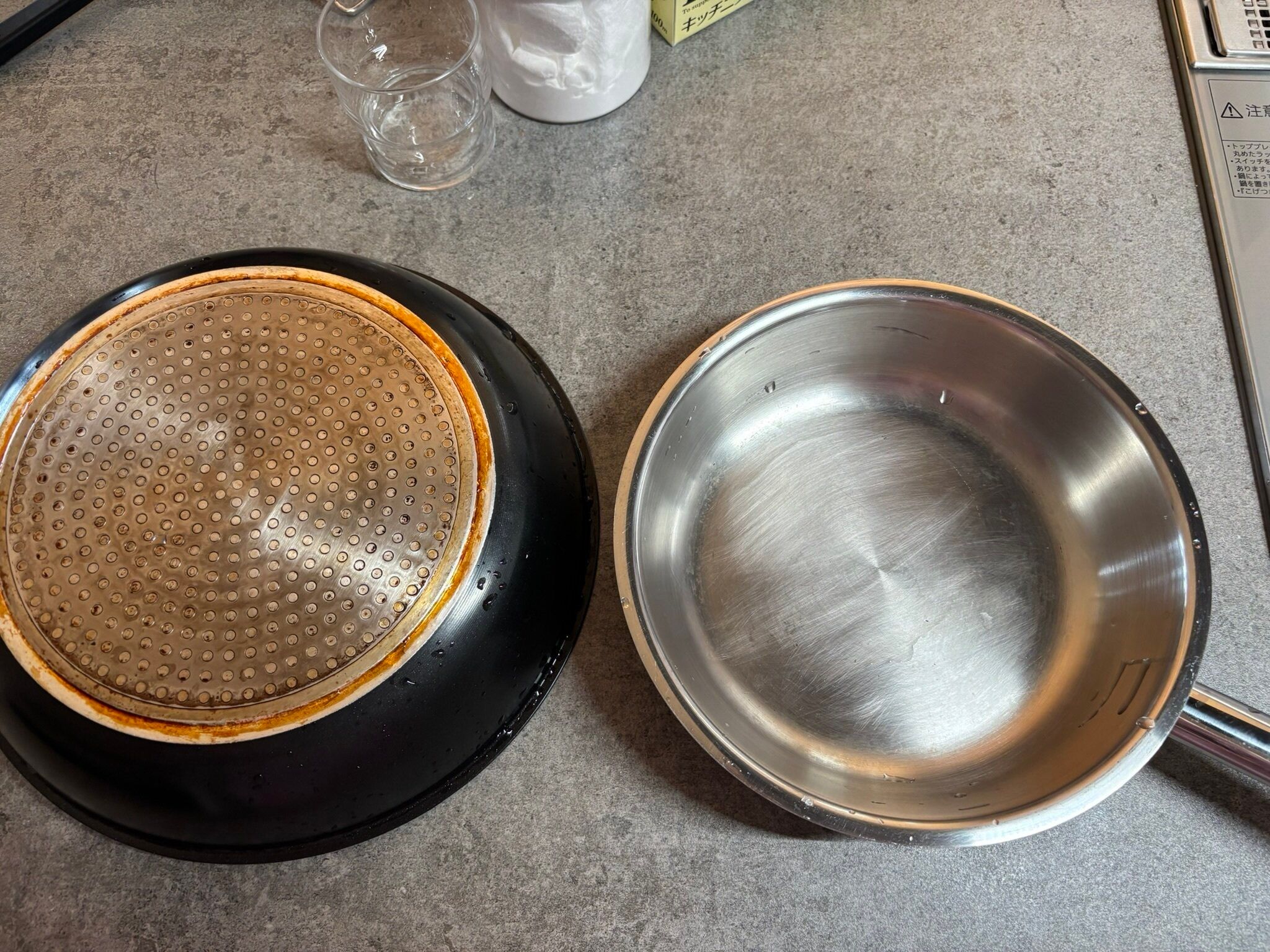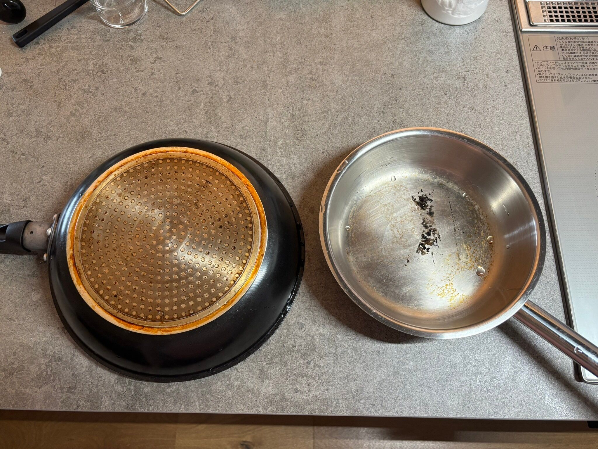 この日はついでにフライパンの裏側のコゲとステンレスパンのコゲも落ちるかなーと実験してみました。
