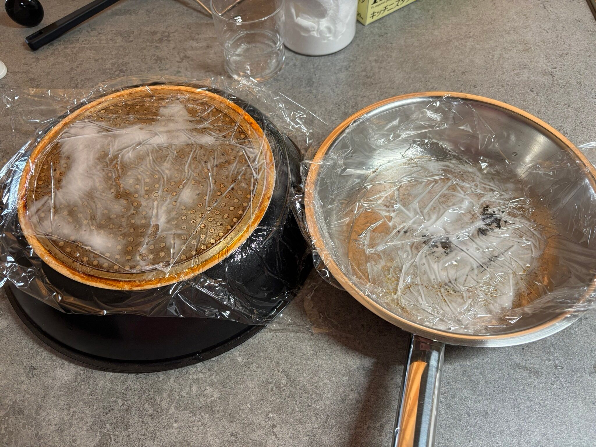 頑固そうな汚れだったので、水をかけたあとしばしラップでパックしてみました。