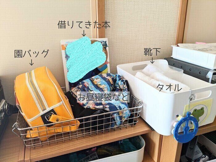 本当はスッキリした見た目が好みですが、息子が簡単にできる仕組みづくりを優先。帰宅後多くの時間を過ごすリビングの横にある部屋に、出しっぱなしOKの園グッズコーナーを設けています。