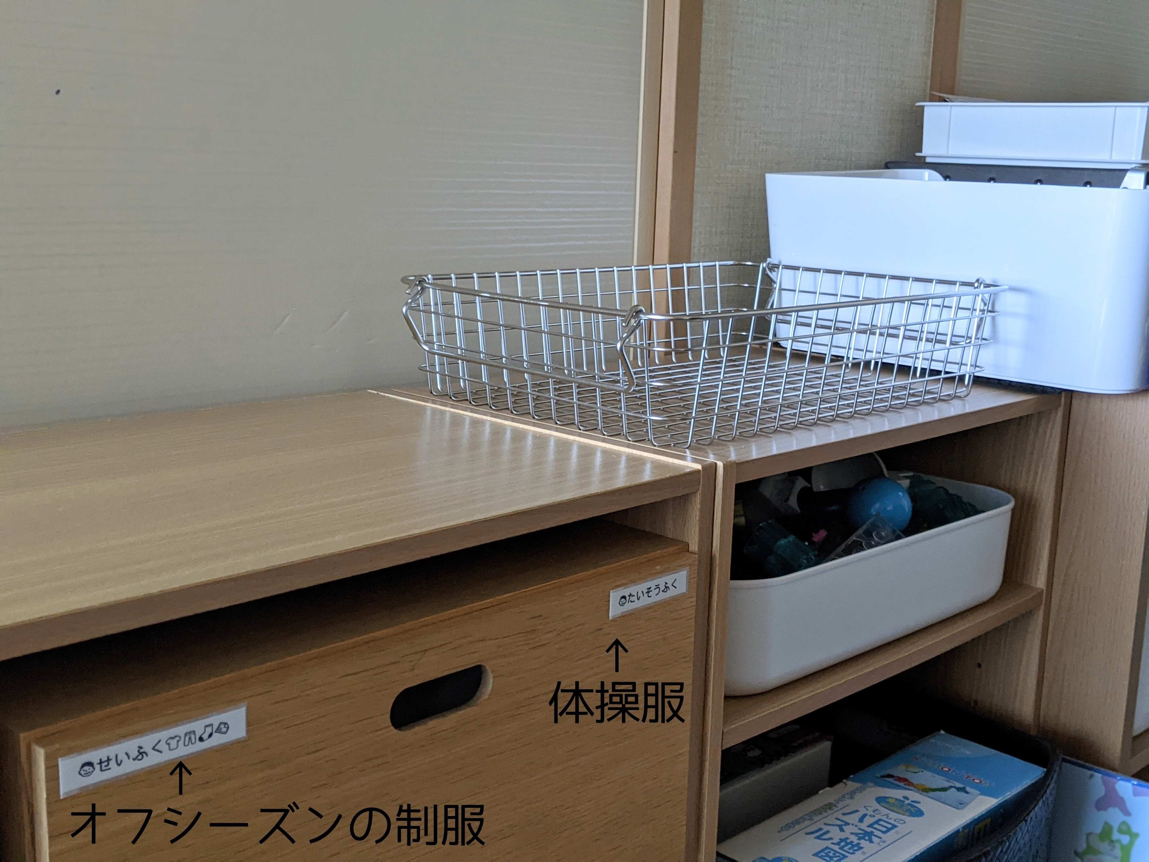 体操服は使用頻度がまちまちなので、園グッズコーナー近くの引き出しに。使用した体操服を洗濯かごに入れ、引き出しから洗濯済みの体操服を出します。