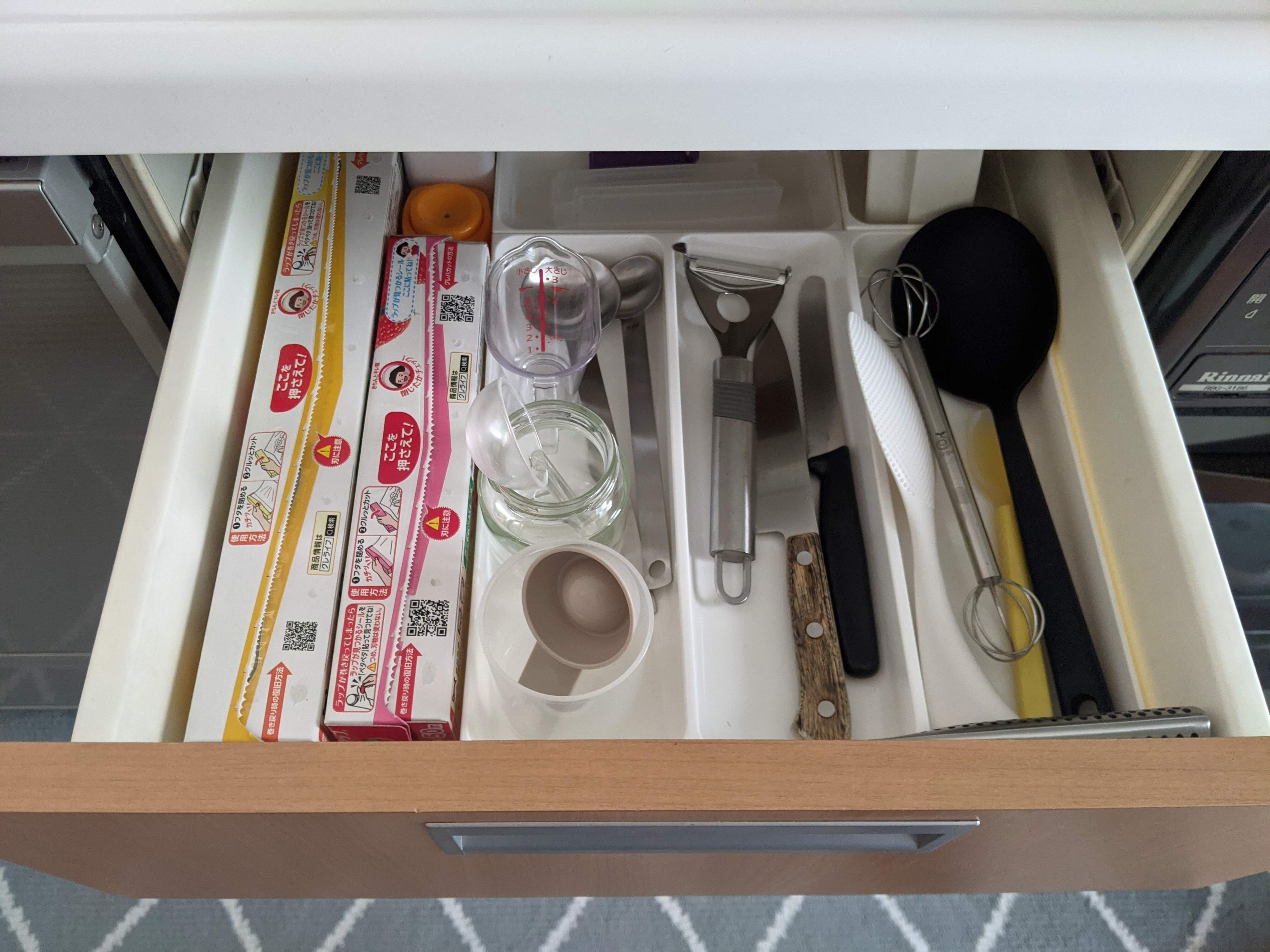 キッチンの1番上の引き出しに収納場所を変えたことで、使うとき・戻すときに移動する必要がなくなり、とてもラクになりました。ちょっとしたことですが、何度も行う作業であればあるほど効果を感じます。