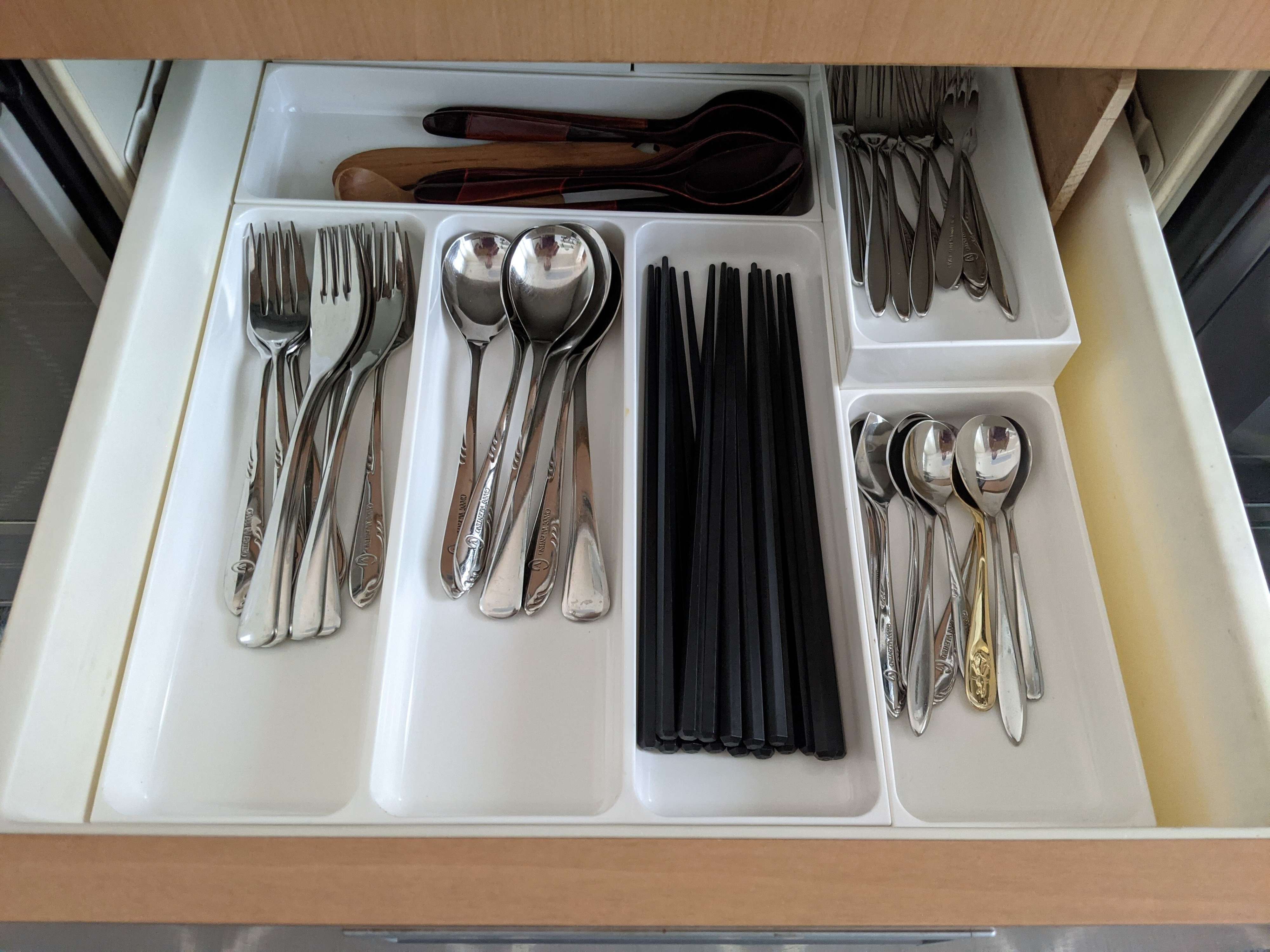箸やスプーン、フォークを料理中にも使用するので、キッチン台の引き出し2段目に。