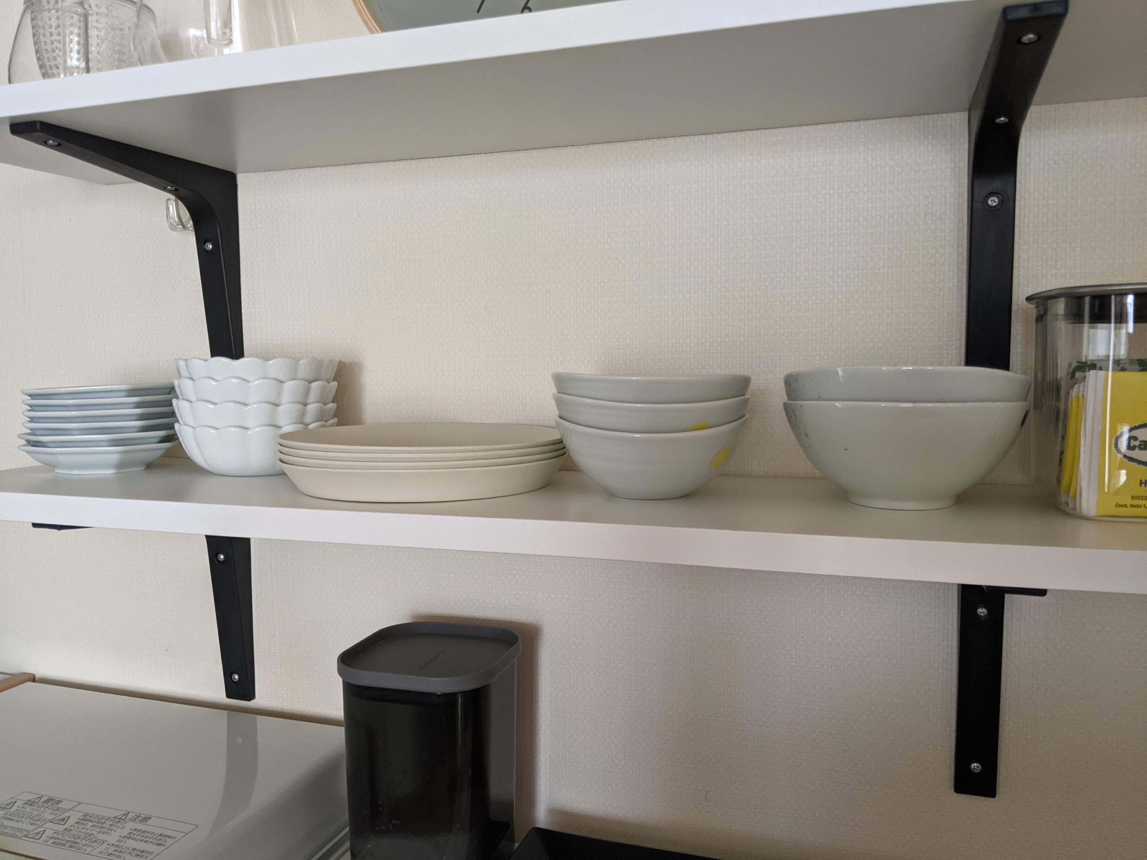 毎日必ず使用する食器は背面のオープン棚に並べるだけ。さっと手に取ることができ、食洗機から戻すのもスムーズです。