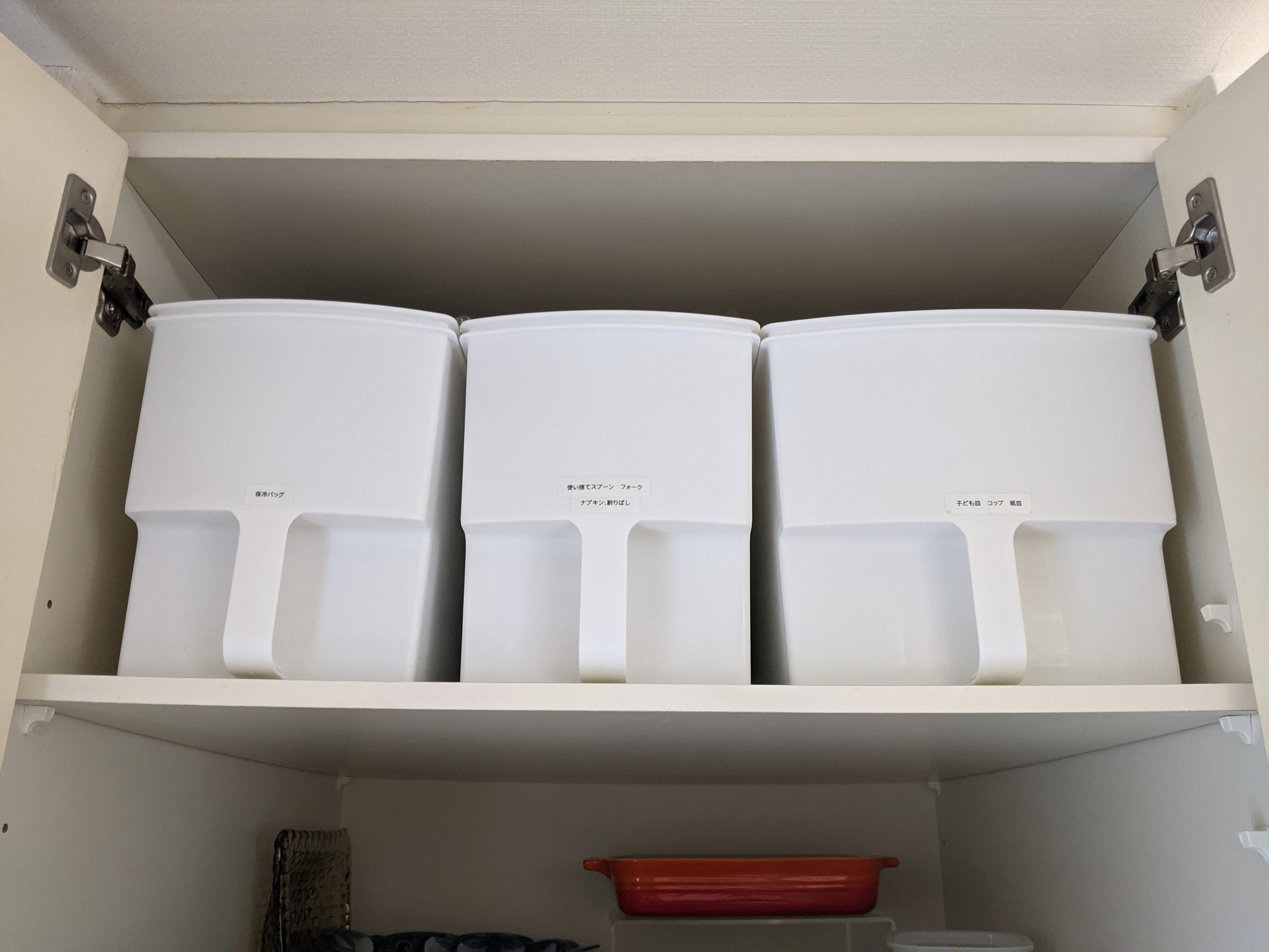 たまにしか使用しないものは最上段に。ただし、持ち手つきの収納ケースで取りやすく。