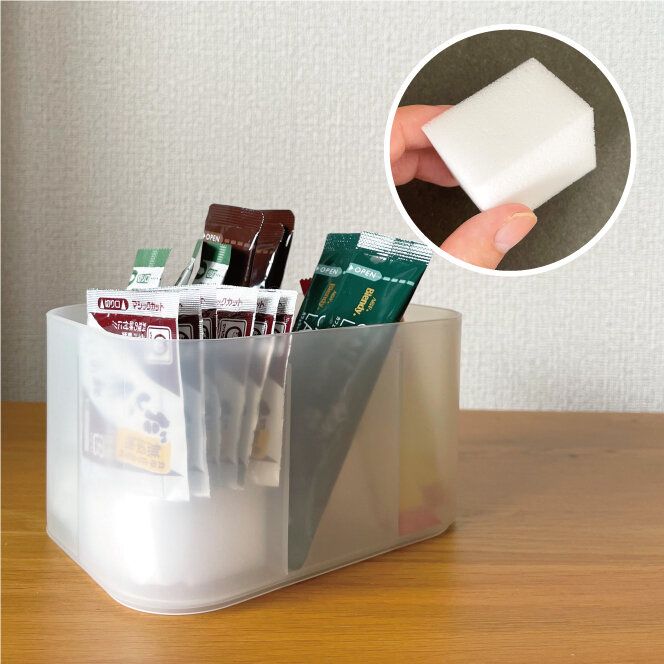 そんな時はメラミンスポンジで底上げすれば小さなモノも取り出しやすく収納できます。