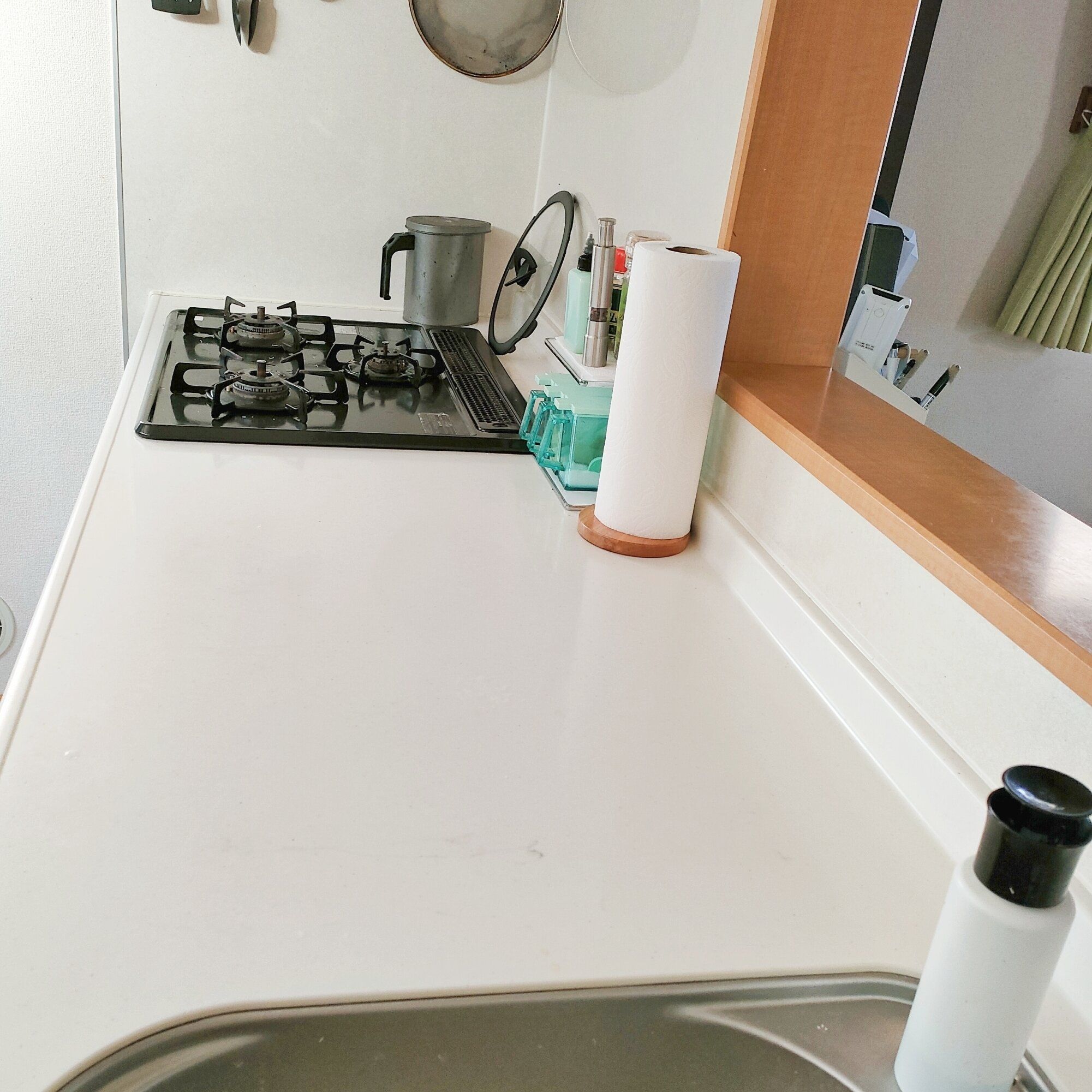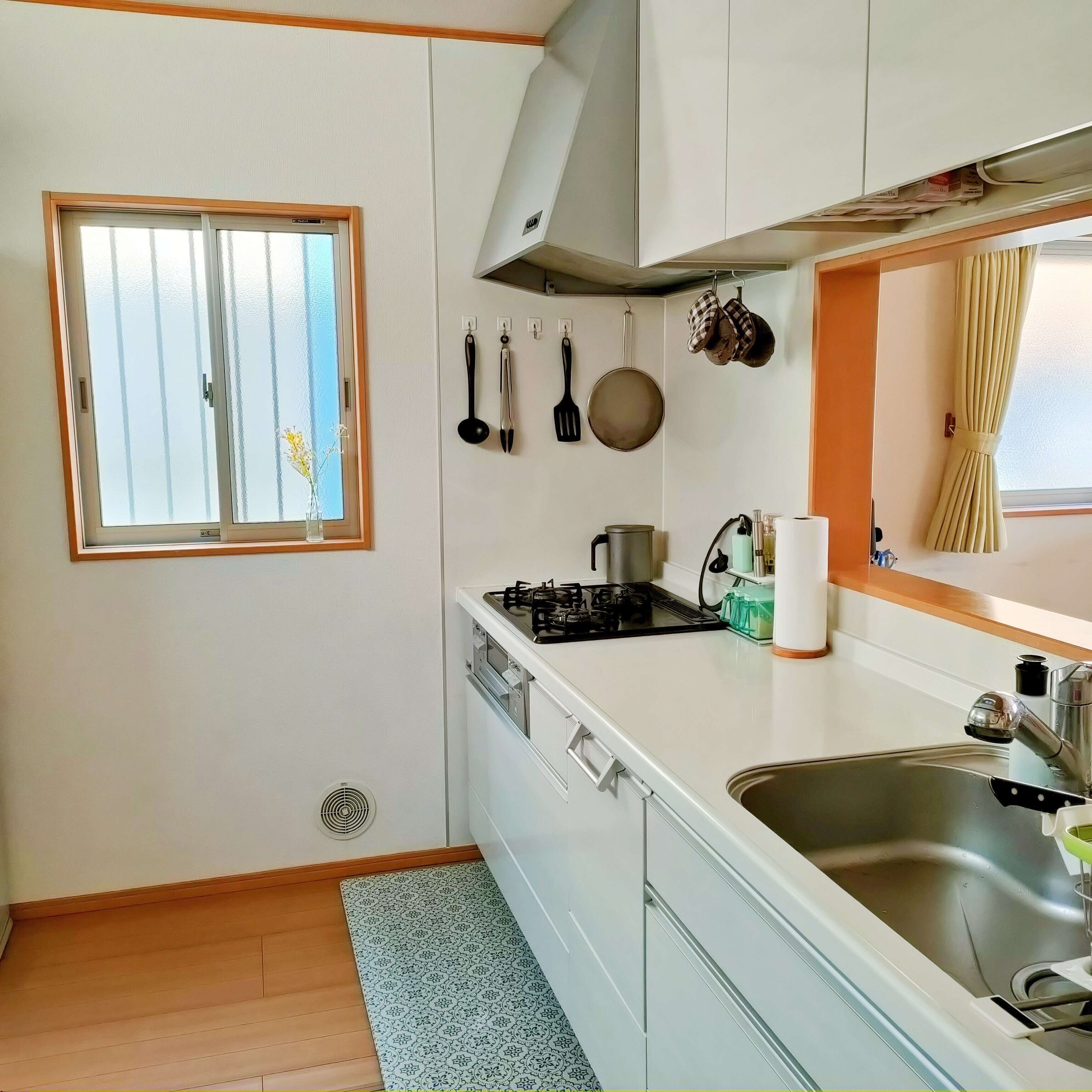 すると、調理スペースがぐんと広がり、効率UP!かける収納によって、すっきりとしたキッチンになりました。