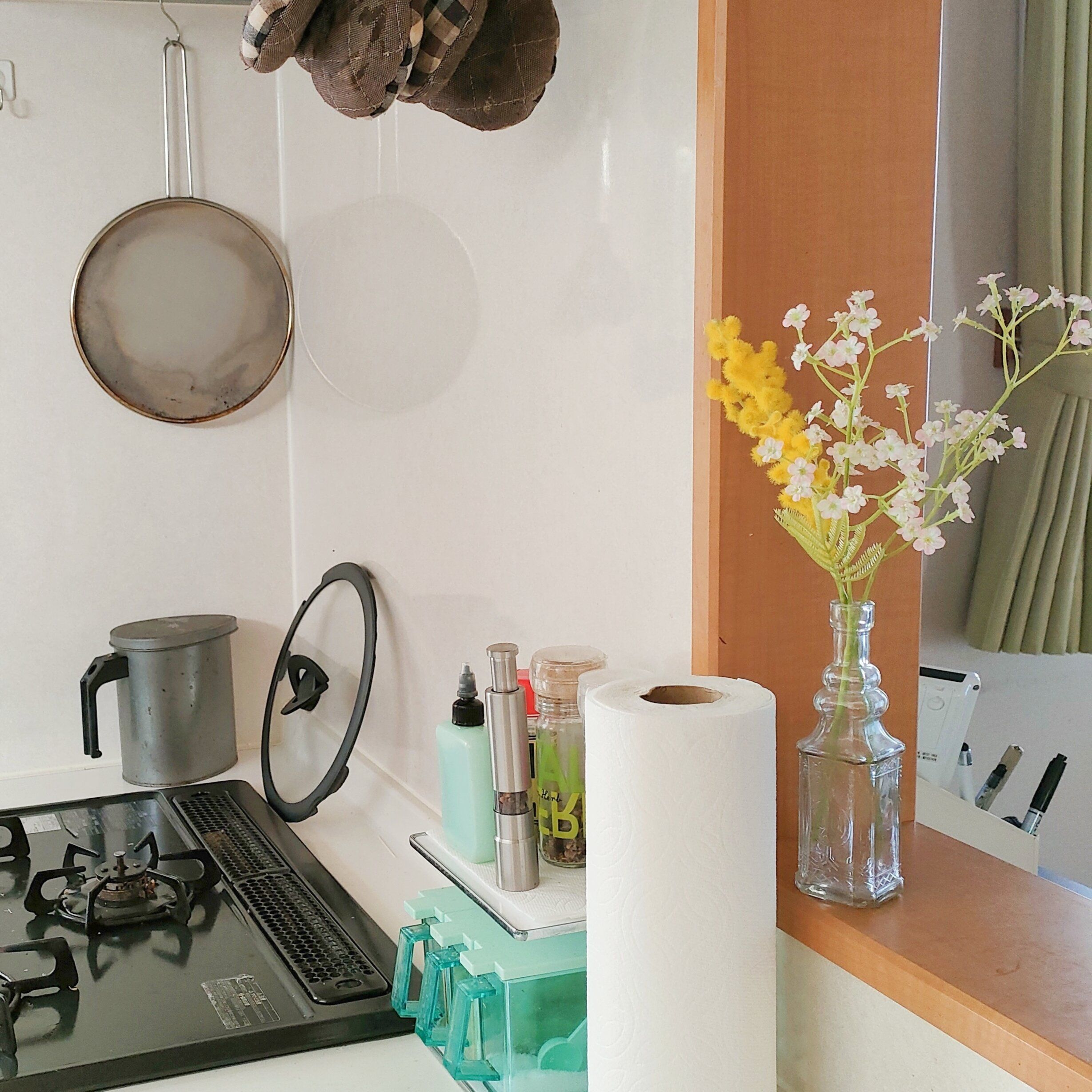 キッチンにお花を飾っている写真を見て、とてもおしゃれにみえました。生花は大変だなと思っていましたが、その方はフェイクグリーンをつかっているとのことで、早速実践!