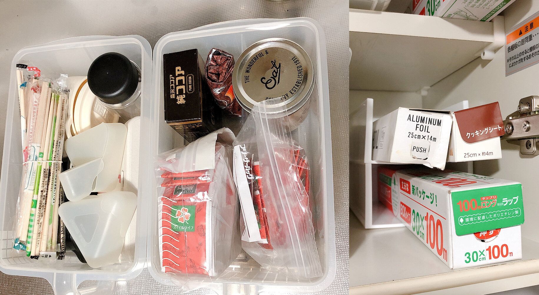 シンクとコンロに挟まれている場所なので、お湯を沸かして淹れる紅茶のティーバッグや、調理中に使うラップなどをここに収納しています。