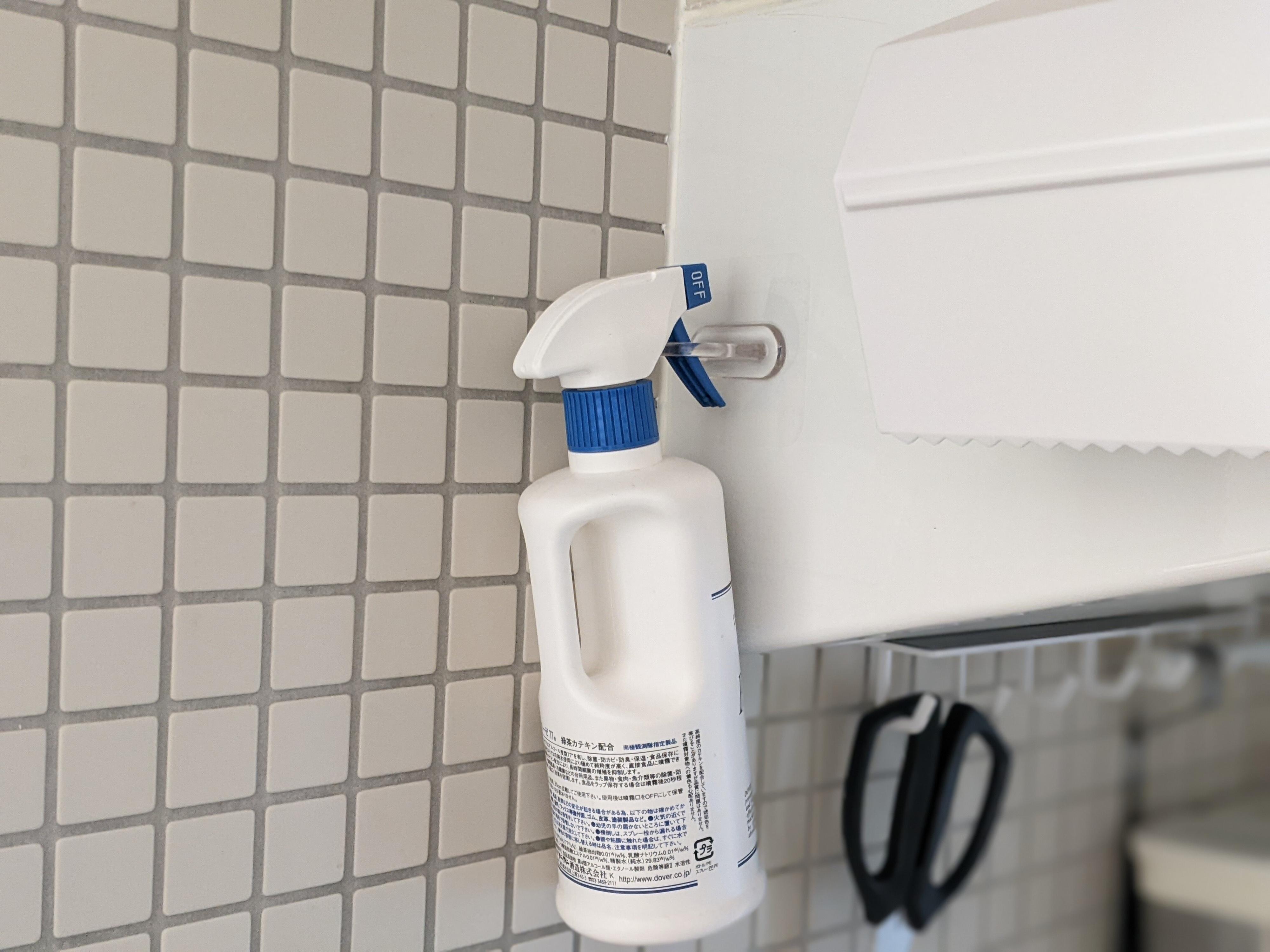 セリアの「何度でも貼ってはがせる フィルムリングフック」をレンジフード側面につけ、アルコールスプレーを掛けています。