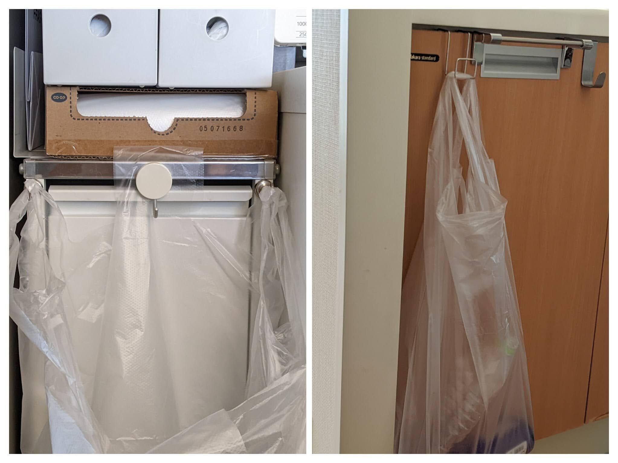 ゴミ箱を購入したものの、捨てるたびに扉を開け閉めするのが面倒になってしまいました。そこで、100均の強力なマグネットフックにゴミ袋を掛けて、簡単に捨てられるようにしています。