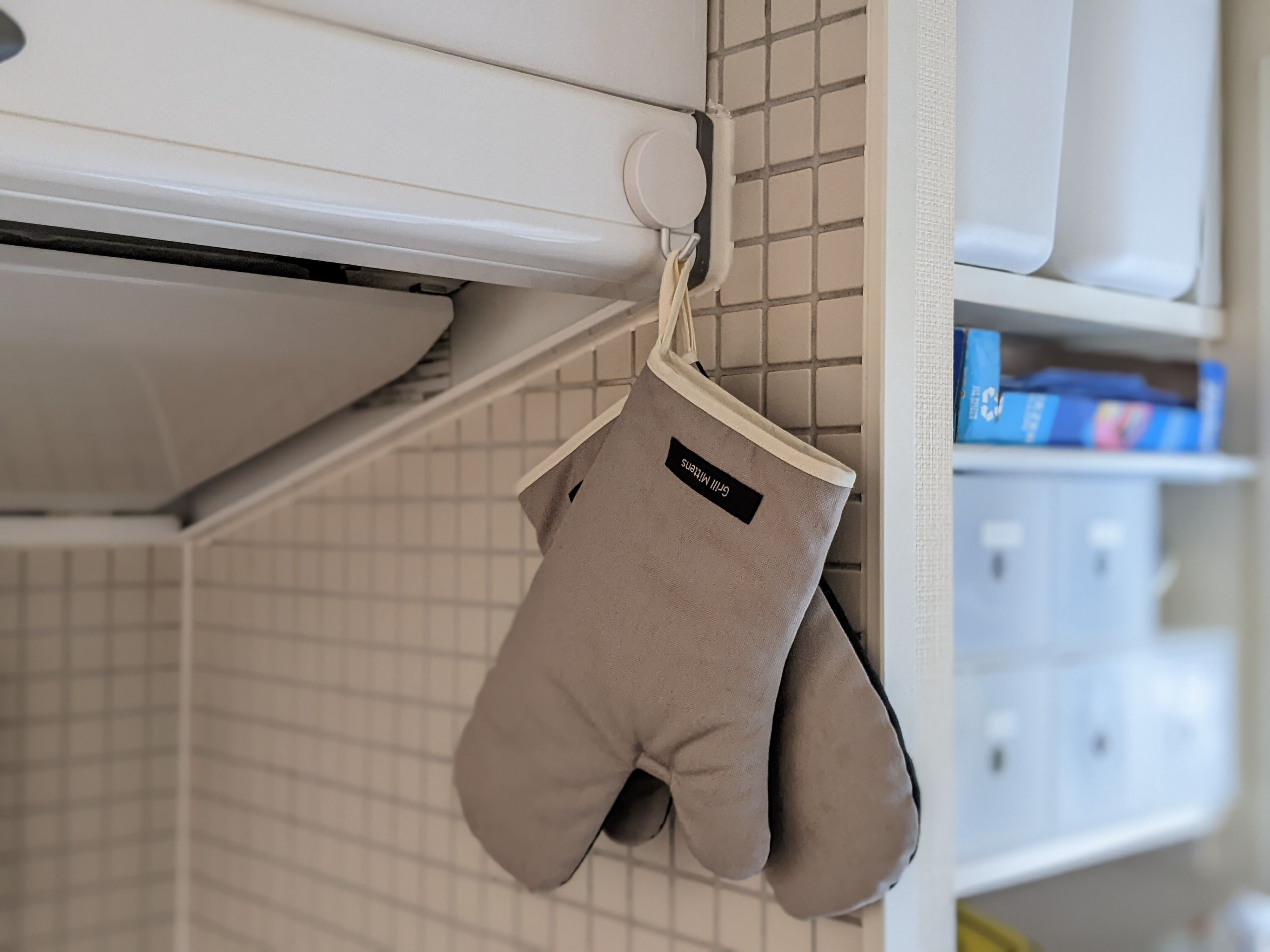 マグネットフックを付け、鍋つかみを引っ掛けています。ガスコンロに近い位置なので、使いたいときにすぐに使えて便利です。