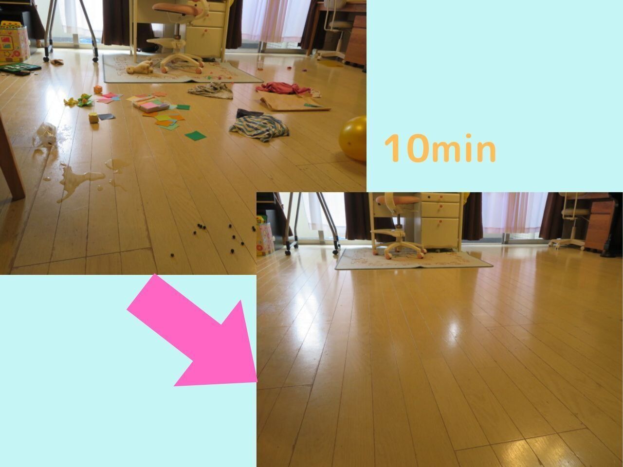 慣れてくると、散らかされても10分以内に元通りにできるようになりましたよ。