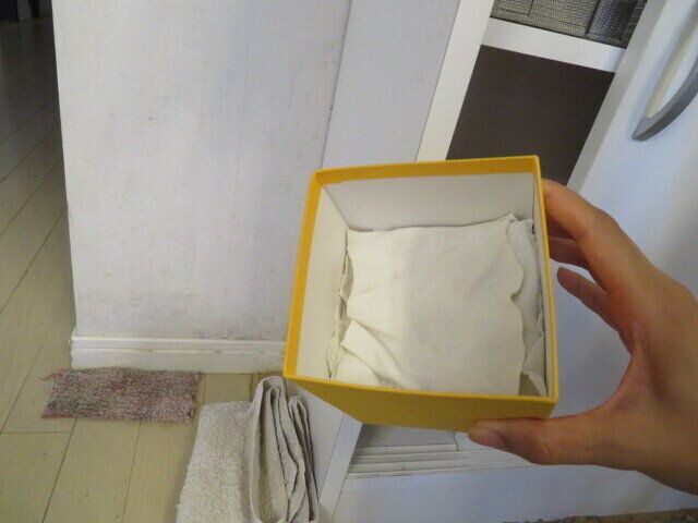 テーブルの上に油っぽいものをこぼした時のために、古着でつくったウエスをお菓子の空き箱に入れ、リビング端に置いた棚の中に隠しています。