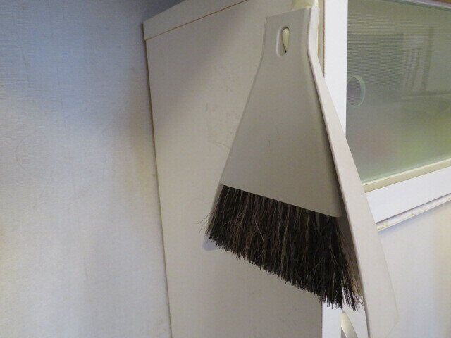 食べこぼし対策としては、同じ棚の上の方にフックをつけてミニほうきをひっかけ、何かあったらそれを使うことに。