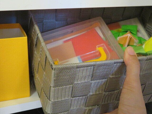 折り紙セットは、箱に入れて棚の中へ。