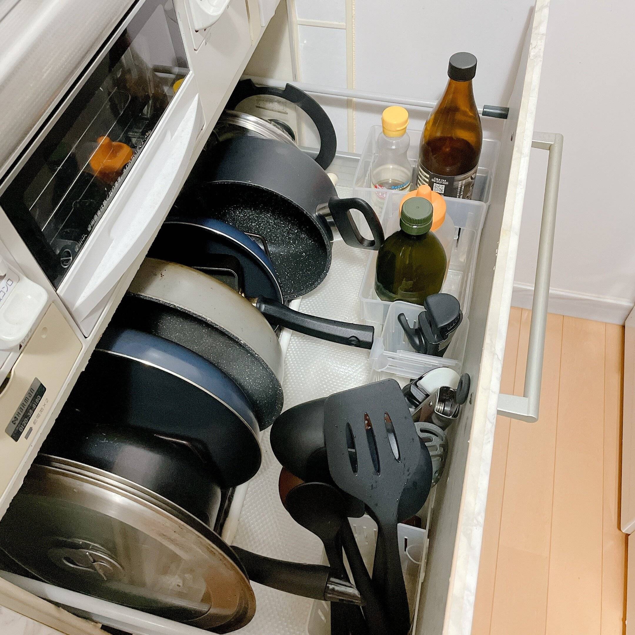 水を使う鍋はシンク下に、という方もいらっしゃいますし、理にかなっているとは思いますが、私はコンロ下に鍋とフライパンを収納しています。