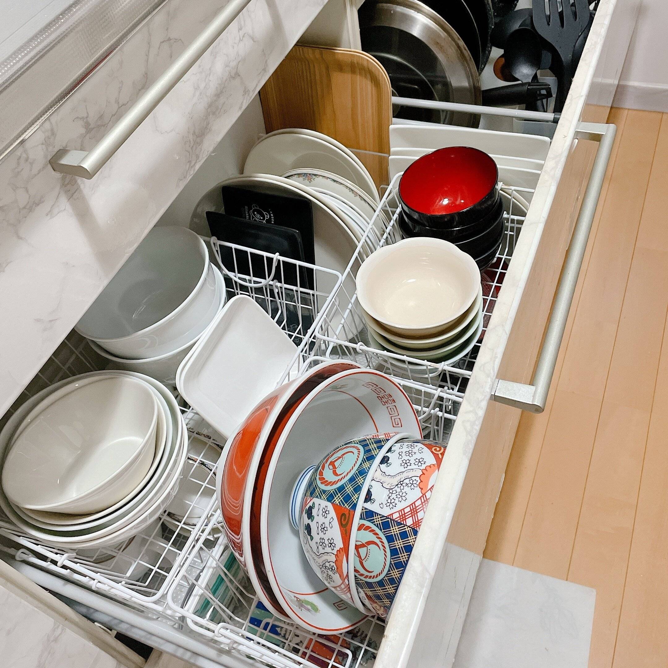 引出しにしまう場合は特に、お皿類は立てて収納してあると使いたいものをすぐに出すことができます。