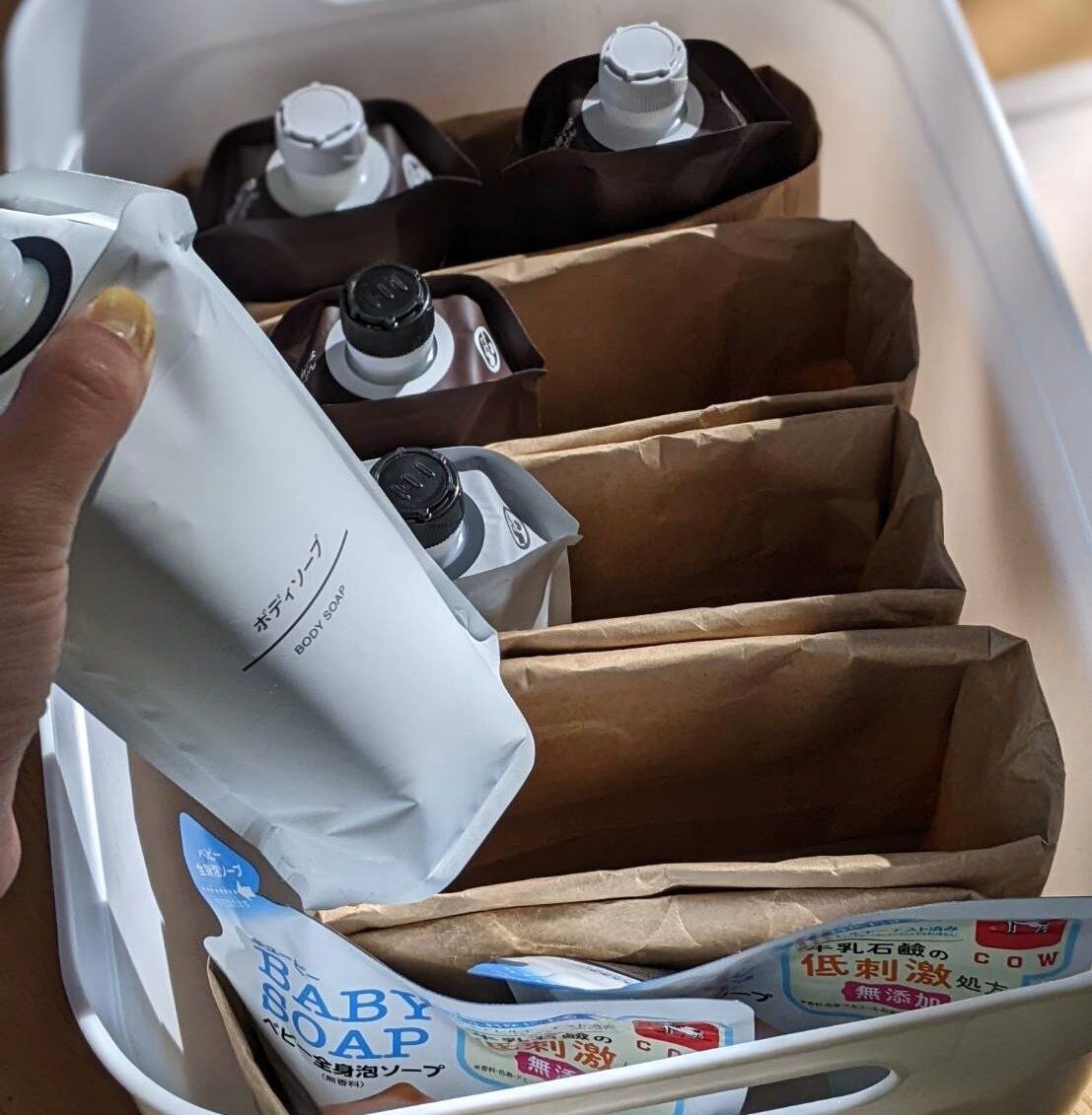 この管理法だと、ギフトバッグにスペースが出来ているアイテムの在庫が減っていることがスグにわかるから、買い物リストの作成が楽々。逆に、ついつい買いすぎてしまう重複買いタイプさんは、アイテム毎に仕切ることで買いすぎ防止にも繋がります。