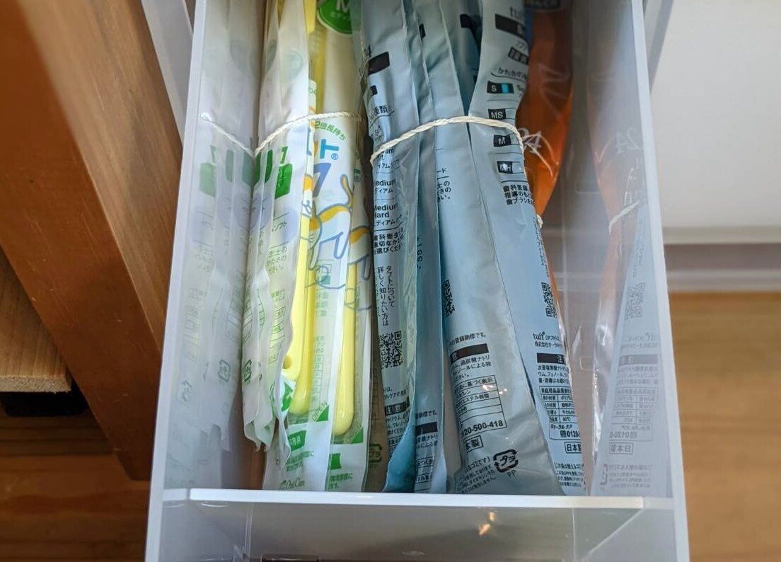 歯ブラシなど、家族の人数分必要な消耗品は、色分け管理が効率的!我が家では人別に歯ブラシの色を決め、ストックは色別に輪ゴムで束ねる収納にしています。