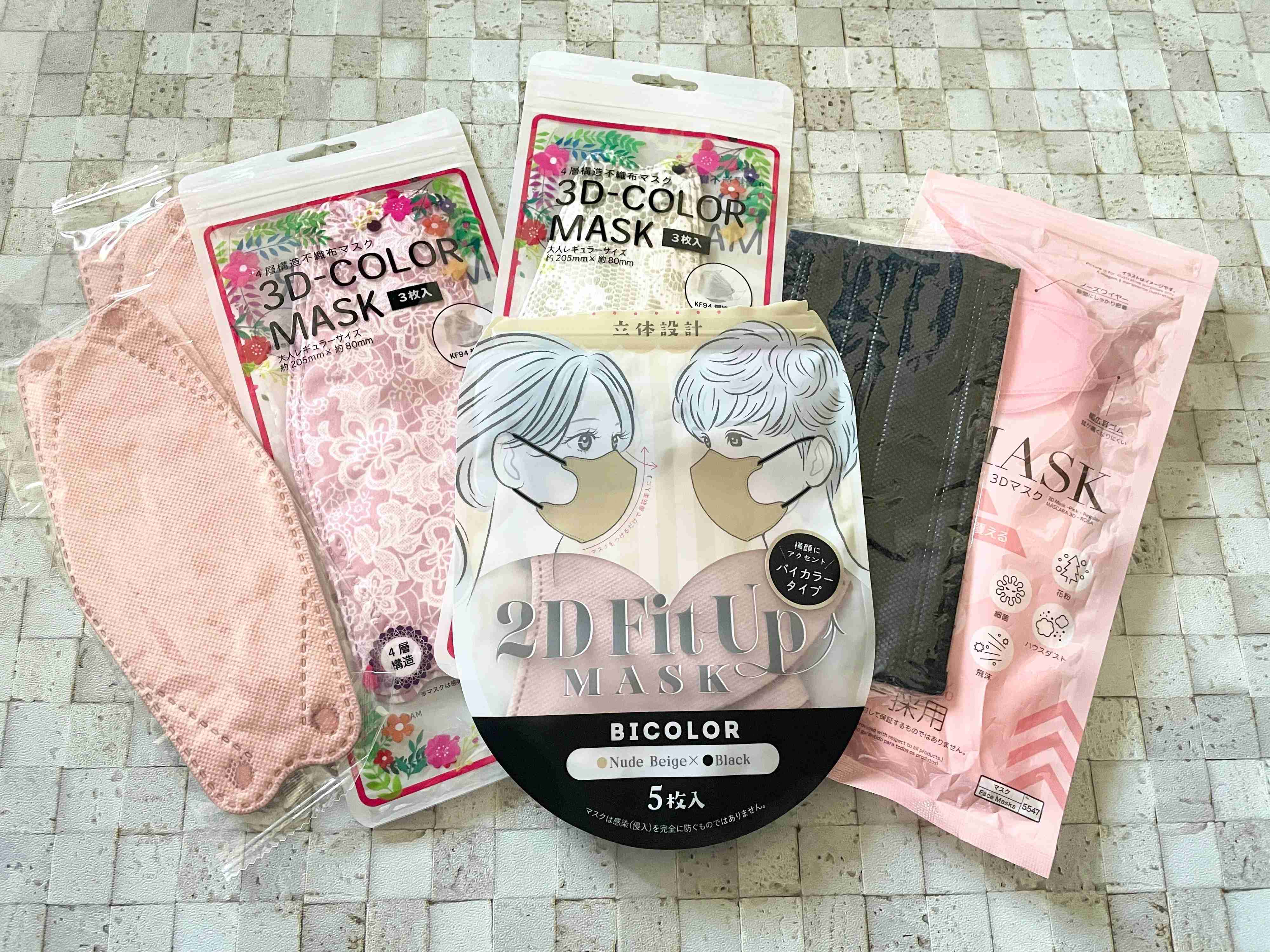 箱型マスクや3Dマスク、血色マスクに鼻が高く見えるマスク、バイカラーマスクなどなど。こんなに色んなマスクが出るとは思いませんでした。