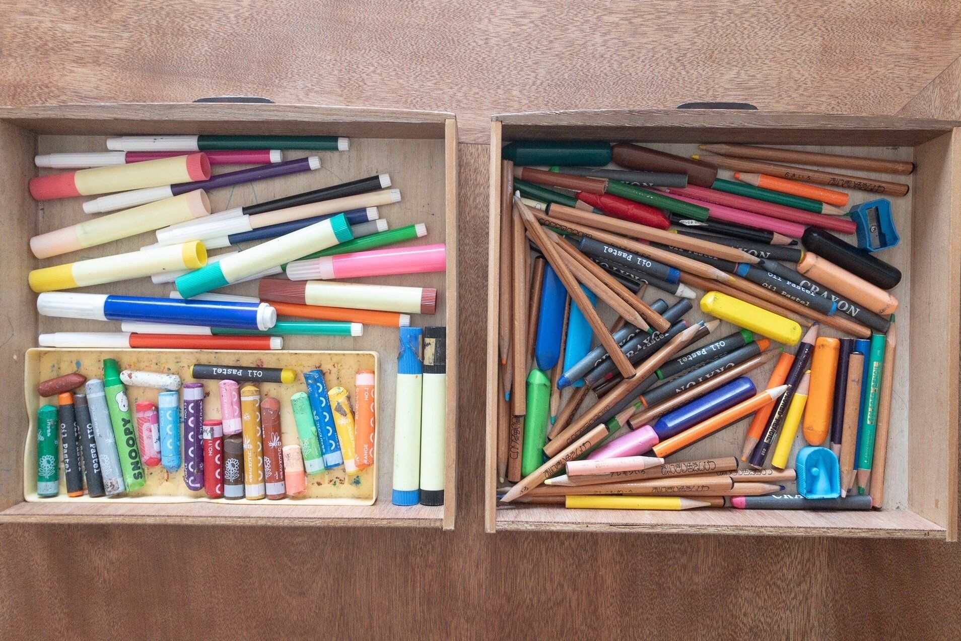 クレヨンは汚れやすいのでケースに入れていますが、色鉛筆や色ペンは中身を出して入れています。