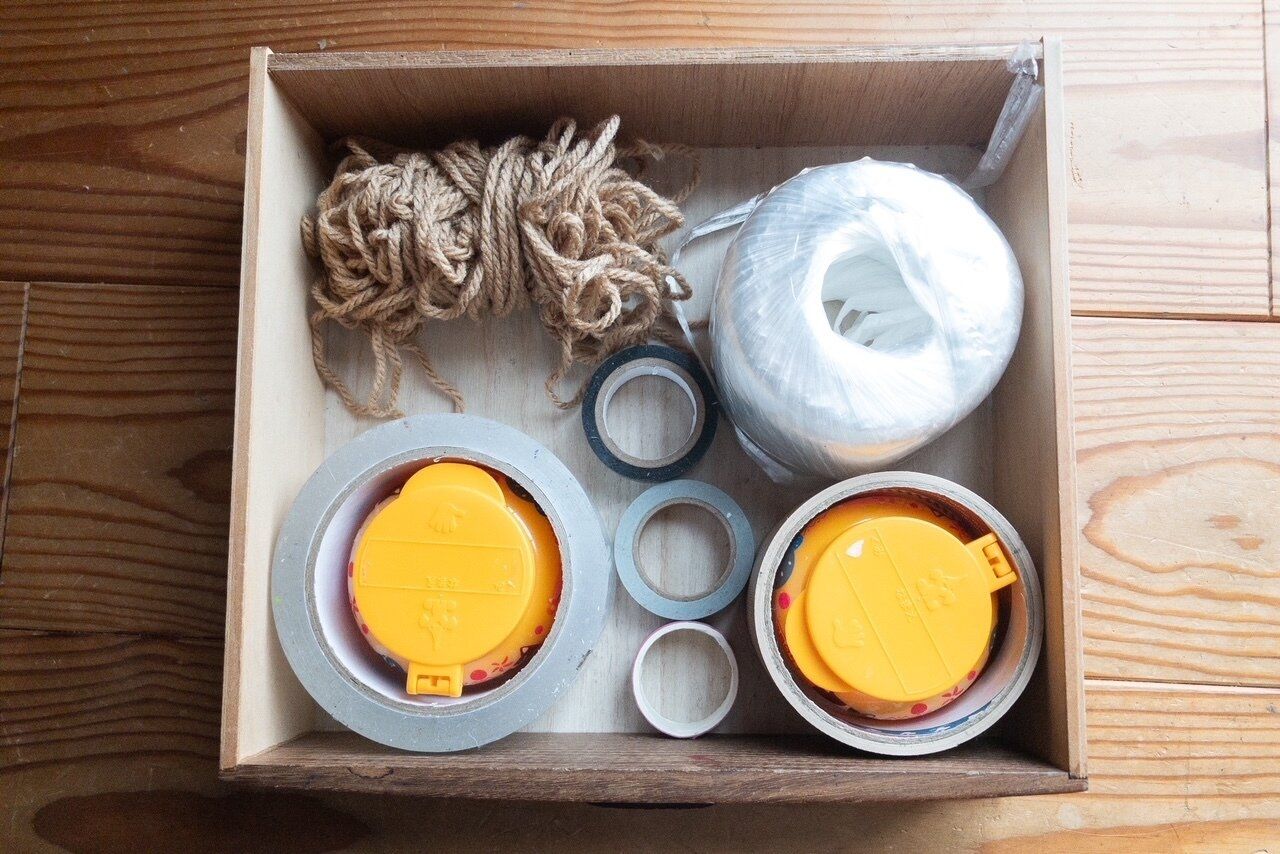 テープ、ガムテープ、マスキングテープ、のり、ナイロン紐、毛糸