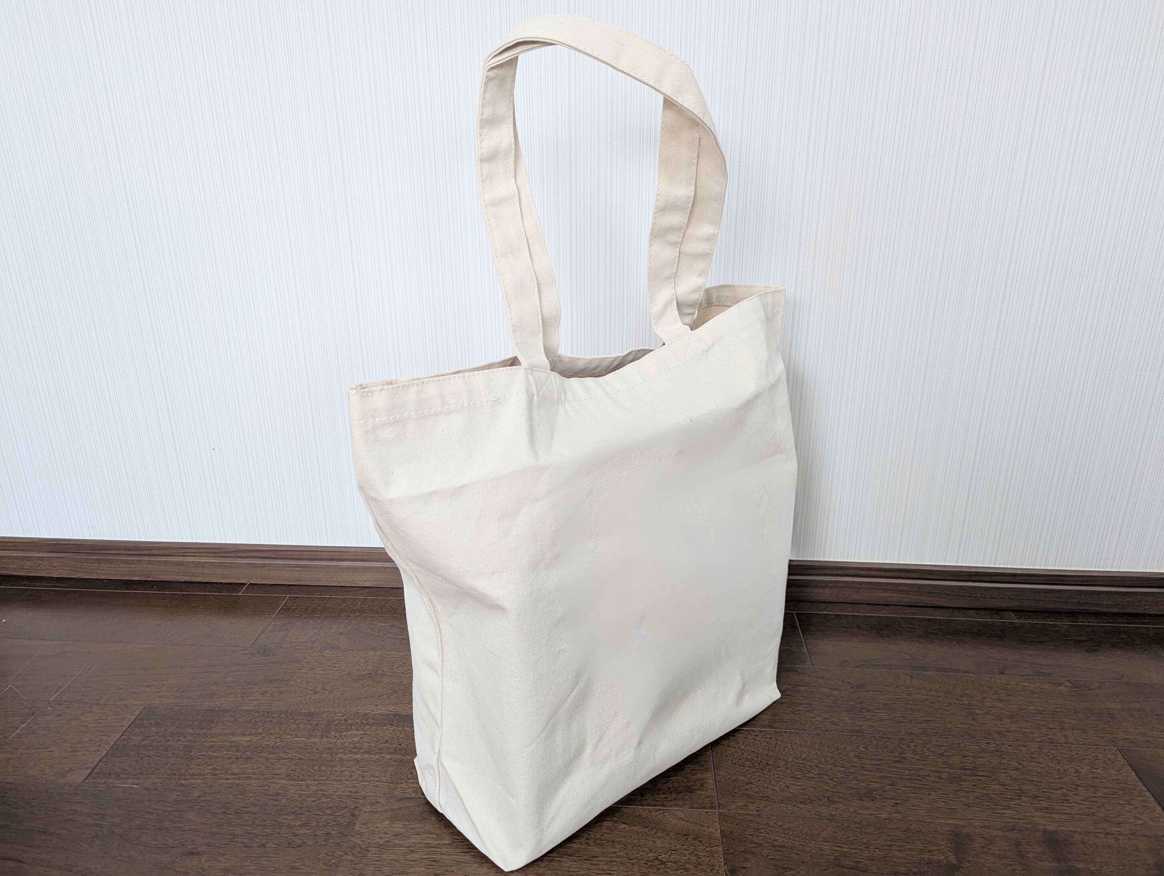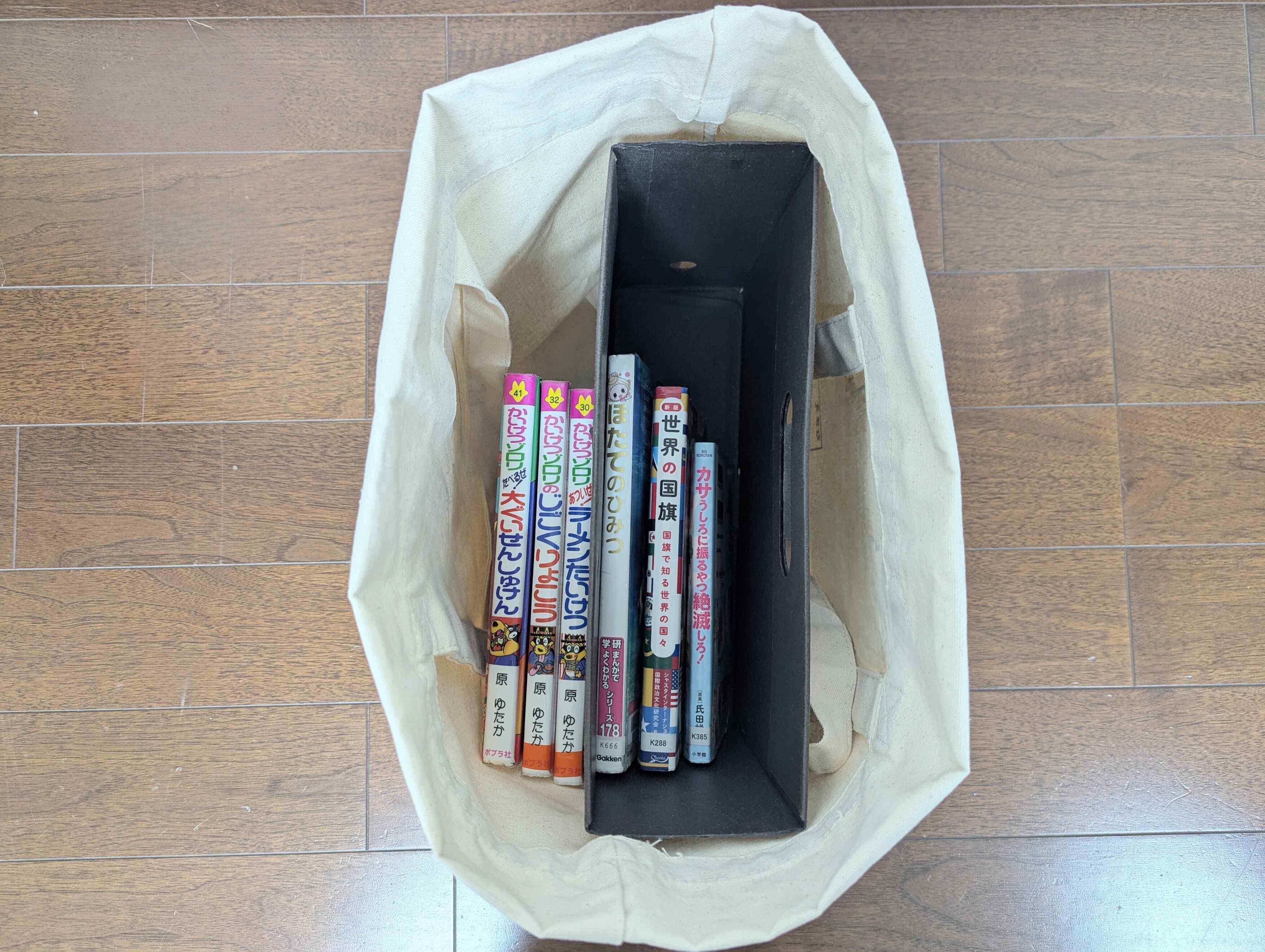 使っているのは、子どもが貸出カードをつくったときに図書館でもらったキャンバストート。市販品では、無印良品の「帆布 横型 トートバッグ(縦31×横46×マチ14cm)」(税込み 1,490円)がよく似たサイズ感です。このトートをリビングの絵本棚の横に置いて、図書館・図書室本の収納に。