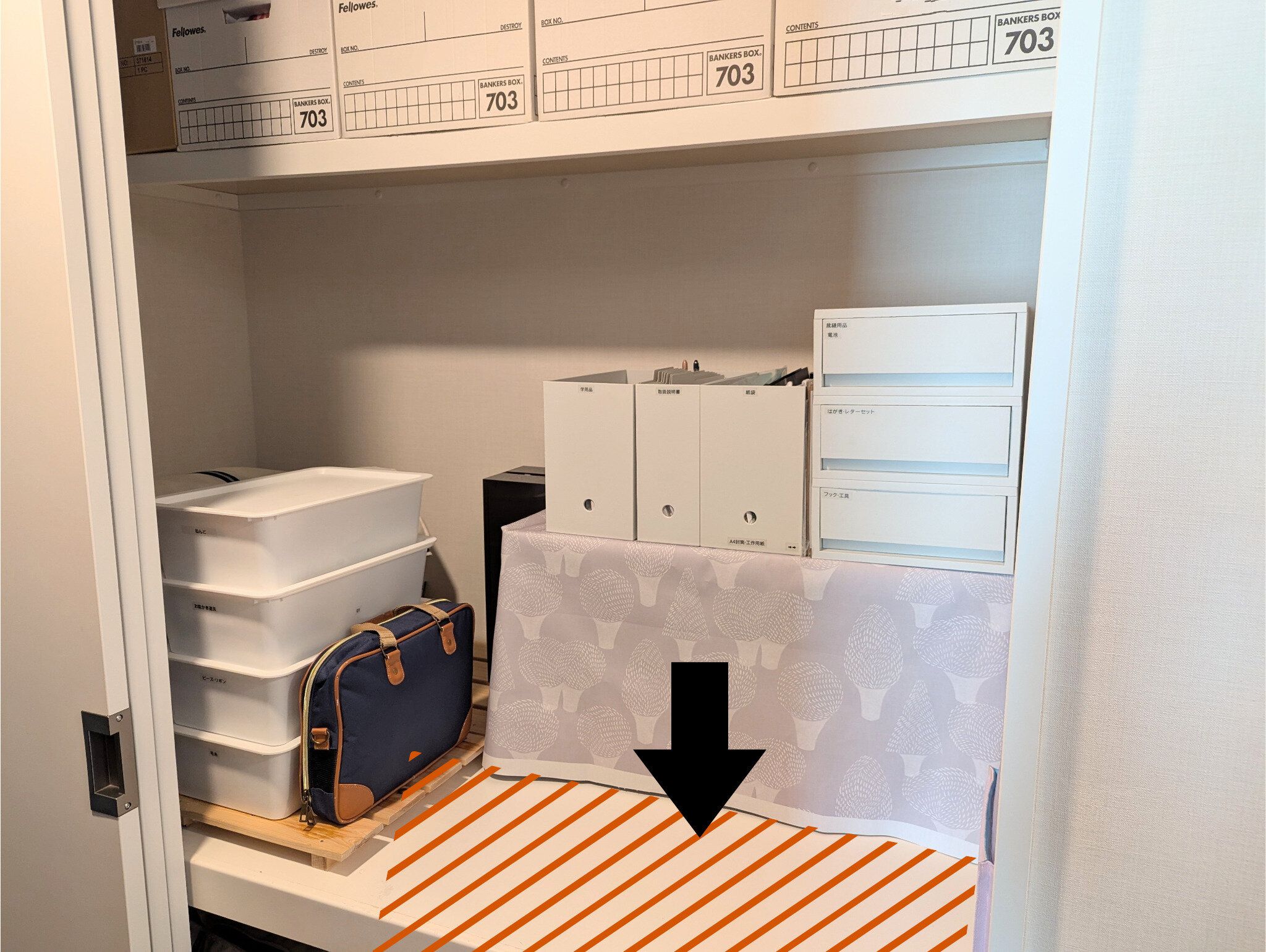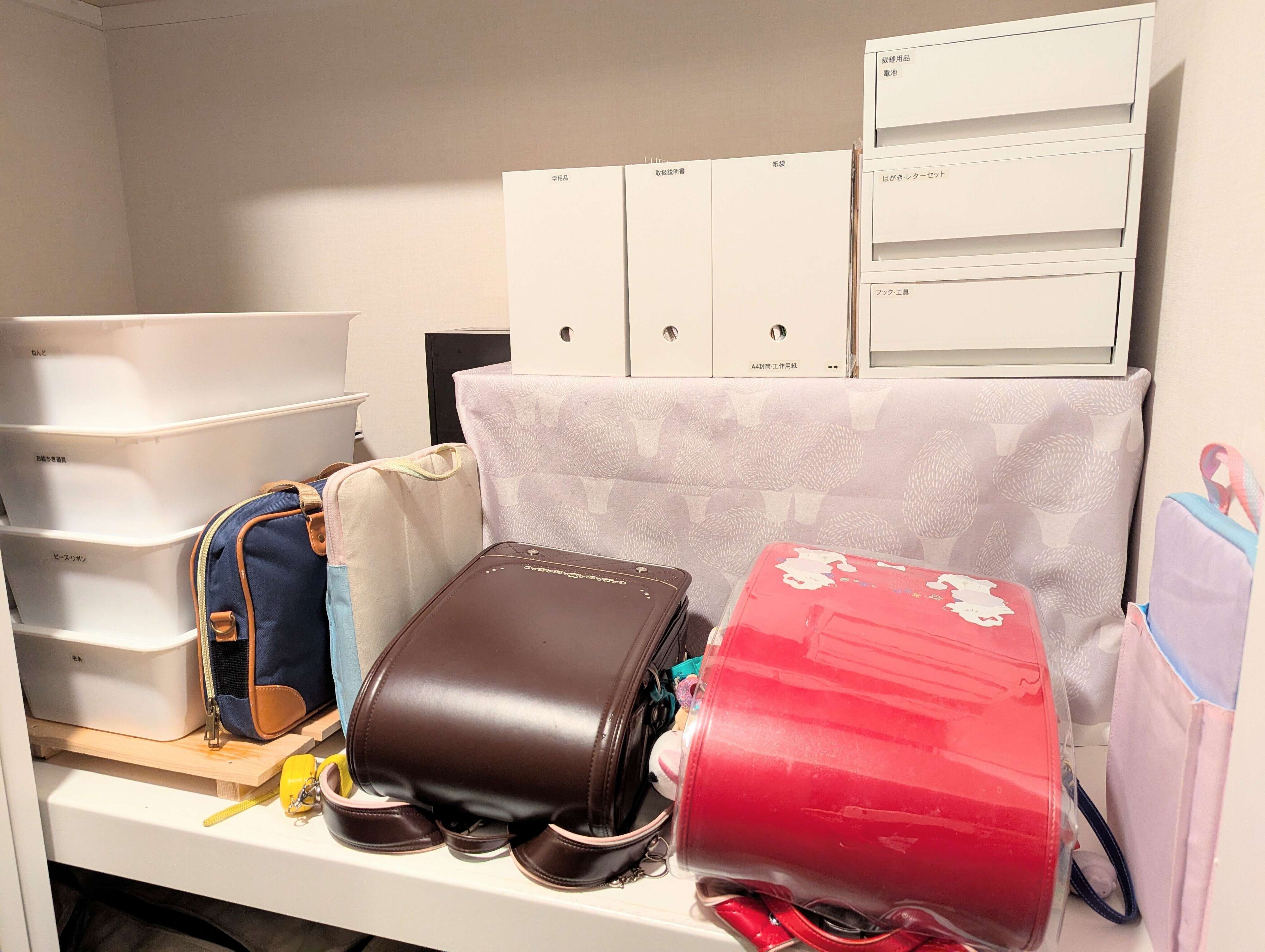 そこで、次に目をつけたのが押入れ。上段を整理してランドセル置き場にしたところ、これまでで一番上手く機能しています。