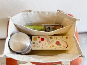 これを使用する前は以前から持っていたトートバッグなどにまとめていたこともあったのですが、通常のトートバッグだと平面に置くと倒れてきてしまっていました。