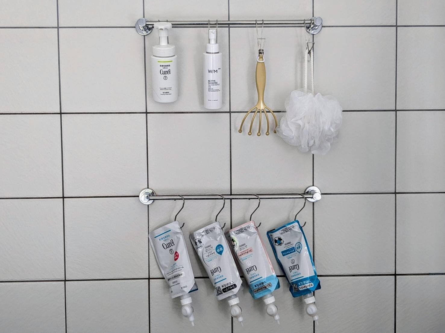 すべてを吊るす収納にすることで、ボトルの底のぬめりとはおさらば!また、詰め替えをそのままフックにかけて吊るしているので、「詰め替え」という名もなき家事をなくすことにも成功しました。