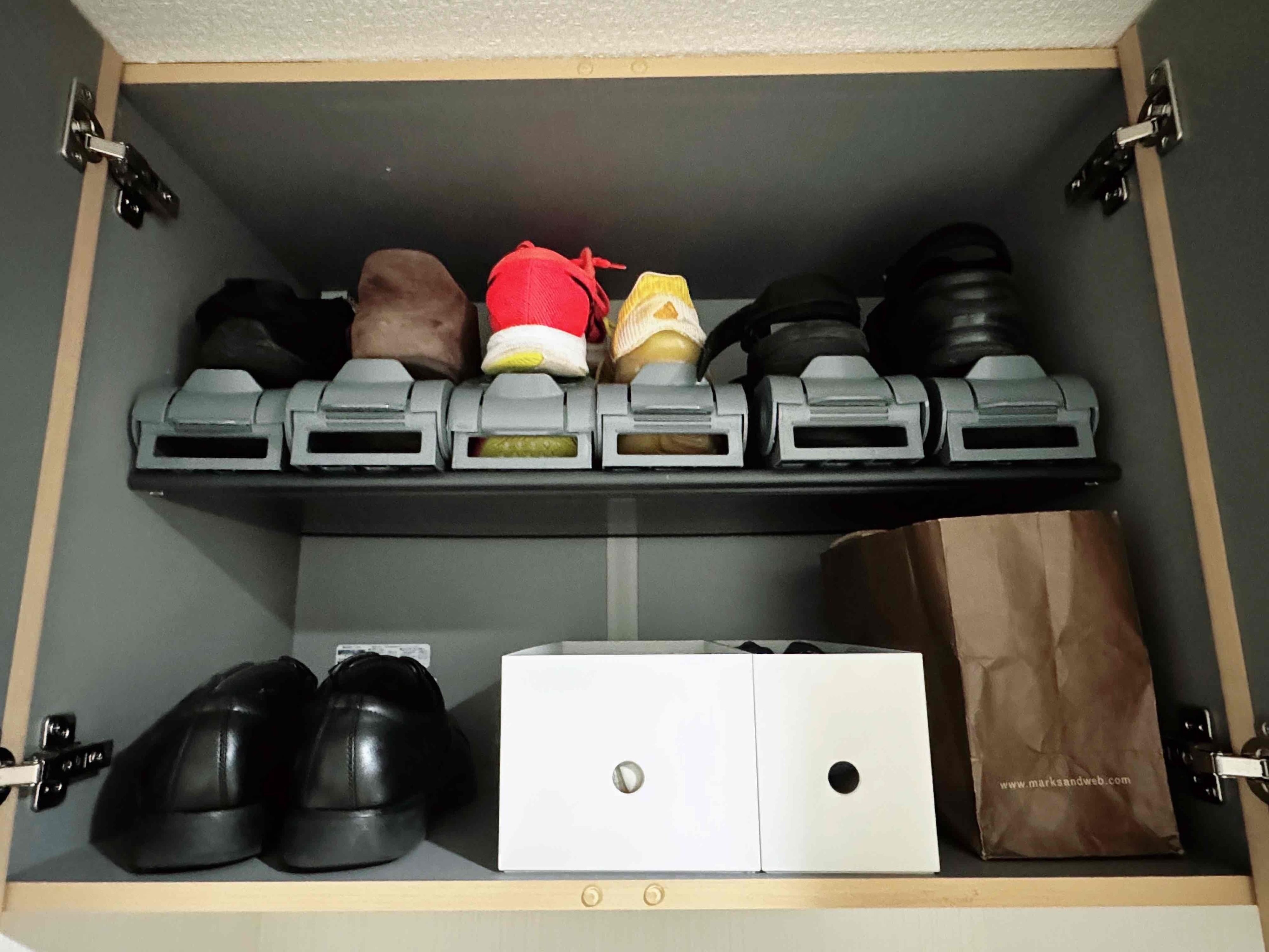 奥行は32cmですが、何と玄関の吊り戸棚の奥行きにぴったりでした。折り畳み傘やミニ空気入れ、参観日用の上履きなどを入れておくのにとても便利!