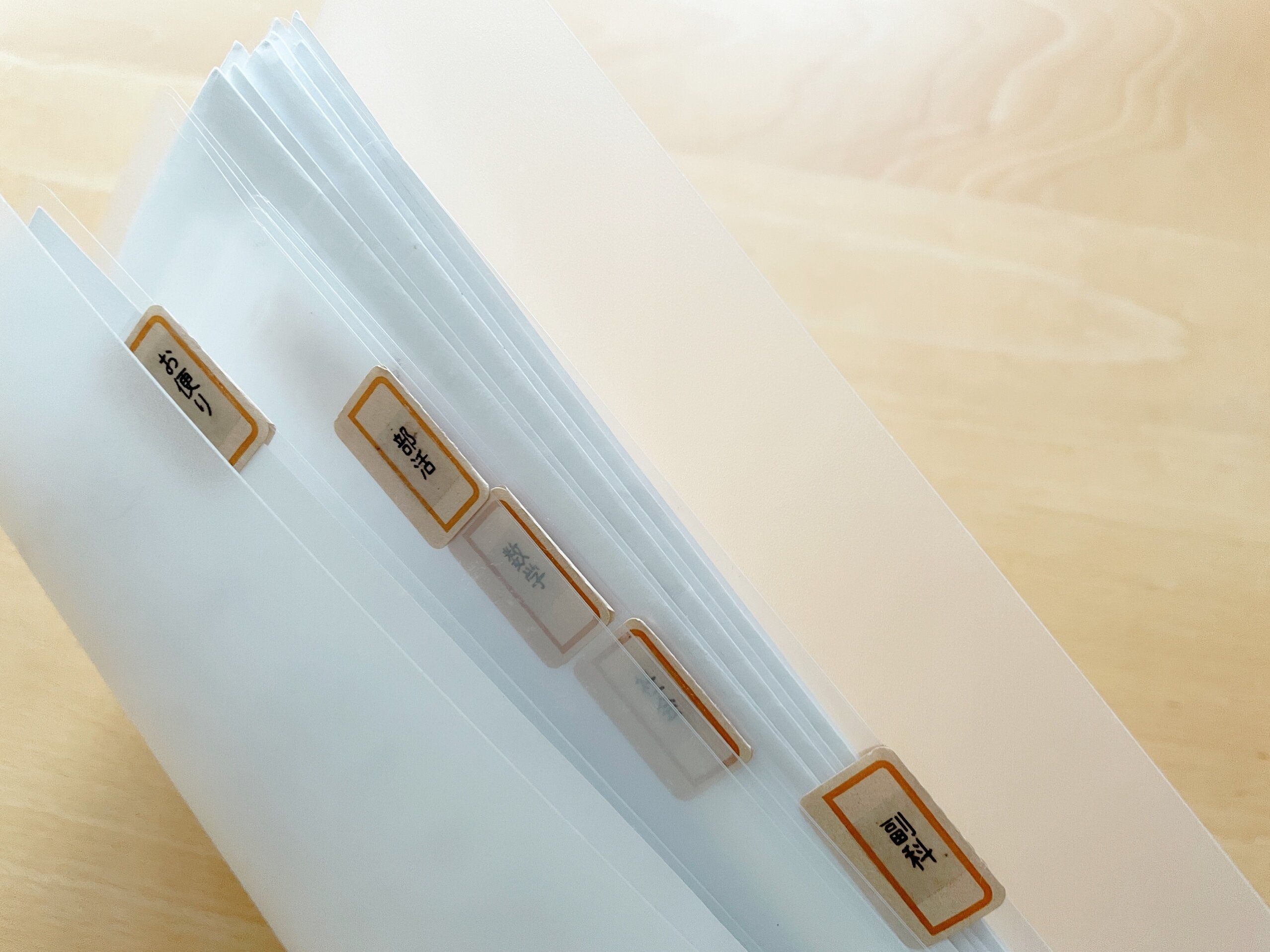 我が家の双子はズボラなので、クリアポケットタイプのファイルは出し入れが面倒で出しっぱなしや入れっぱなしになる可能性が大と判断してやめました。じゃばらタイプのファイルケースは持ち運びには不便かつ分類が多すぎると探すのも面倒ということで、使うことにしたのが無印良品のスリムポケットホルダーです。