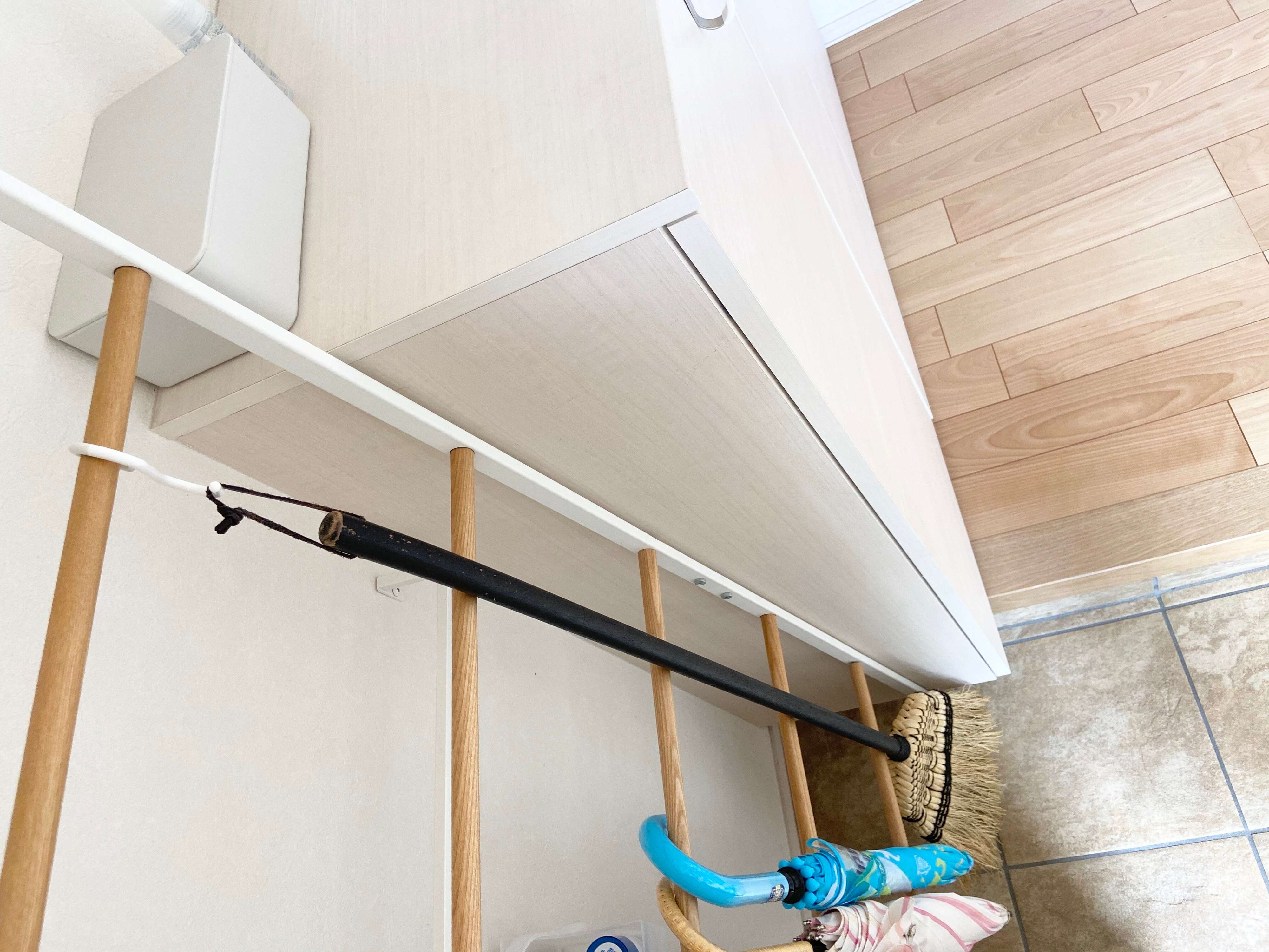 掃除は毎日ではなく、ゴミや砂、枯葉などが気になった時にしかしません。でも、気になった時にすぐに掃除ができるようにホウキは玄関ラダーに引っ掛けて、出しっぱなしの収納に!会社への出勤時、家族が出かけて玄関にちょうど靴が何もなくなったタイミングで砂埃を外に掃き出すようにしています。